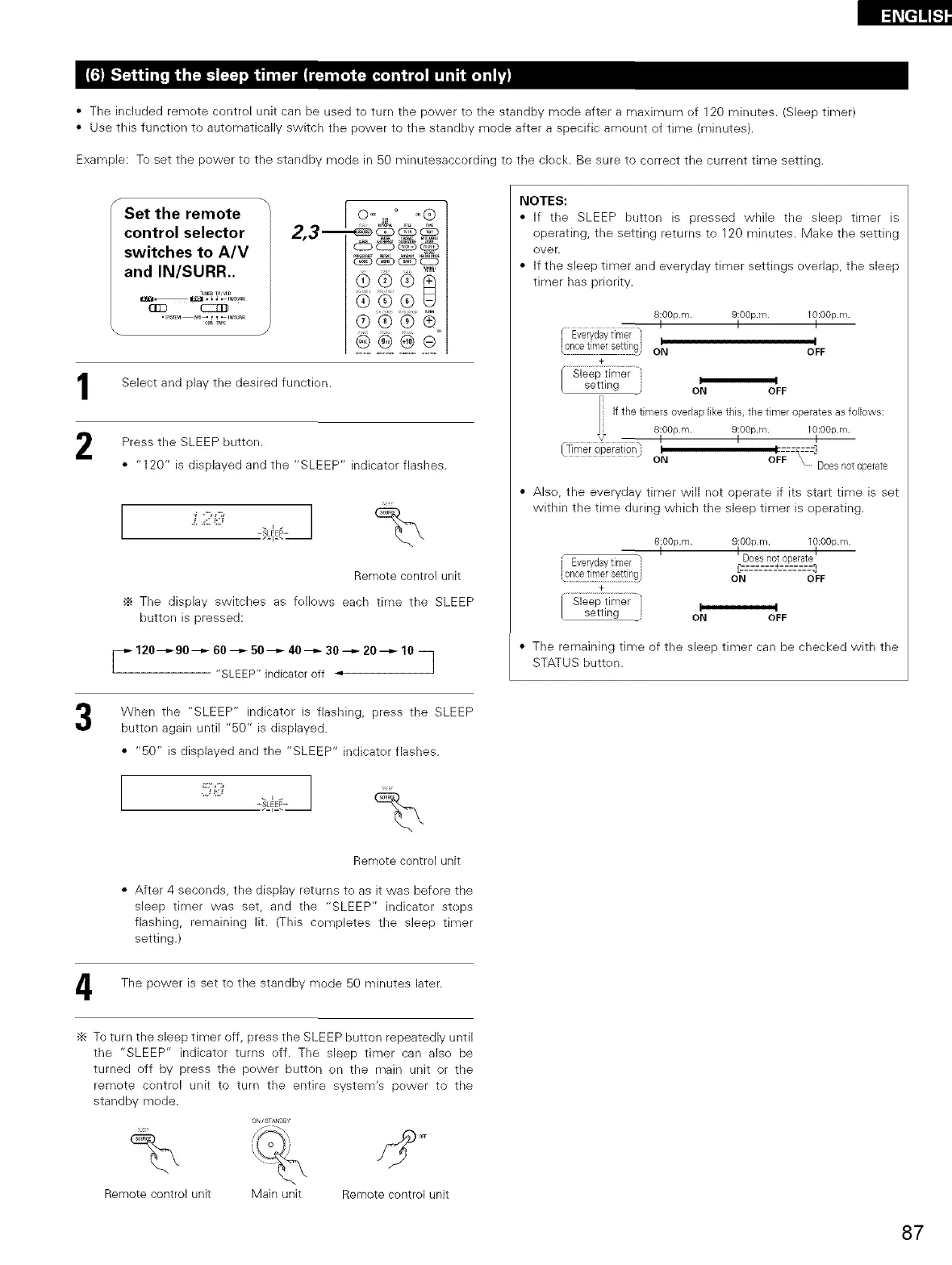 • The included remote control unit can be used to turn the power to the standby mode after a maximum of 120 minutes. (Sleep timer)