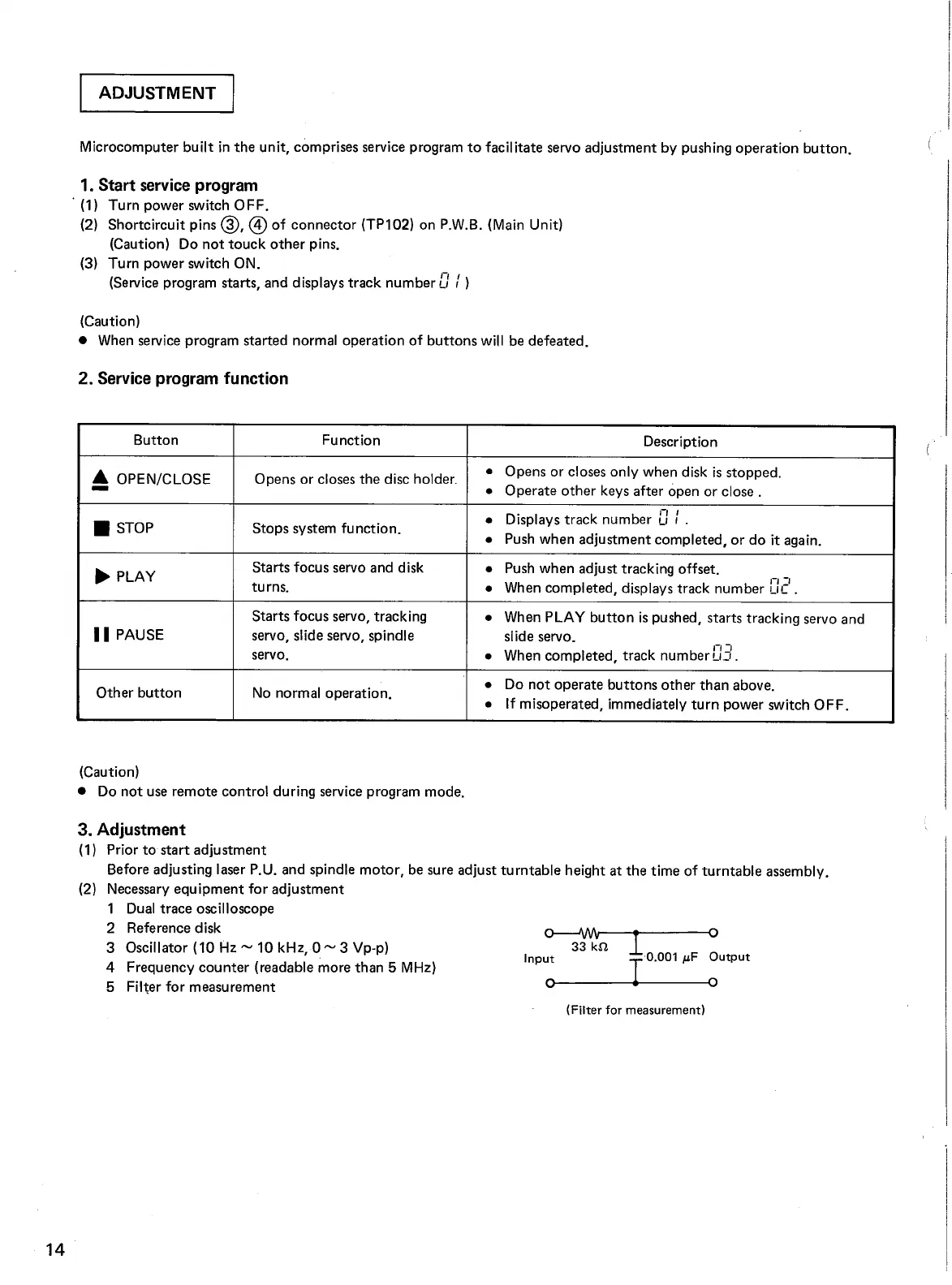 Denon DCD-1400 - ADJUSTMENT PROCEDURES; Starting the Service Program; Service Program Functionality; Pre-adjustment and Equipment Needs