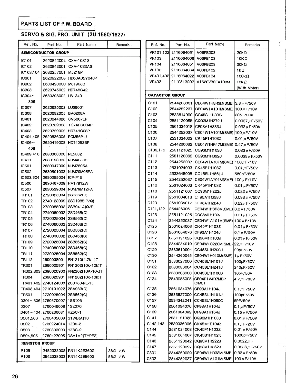 Denon DCD-1400 - Parts List of P.W. Board; Servo & SIG. PRO. Unit (2 U-1560;1627)