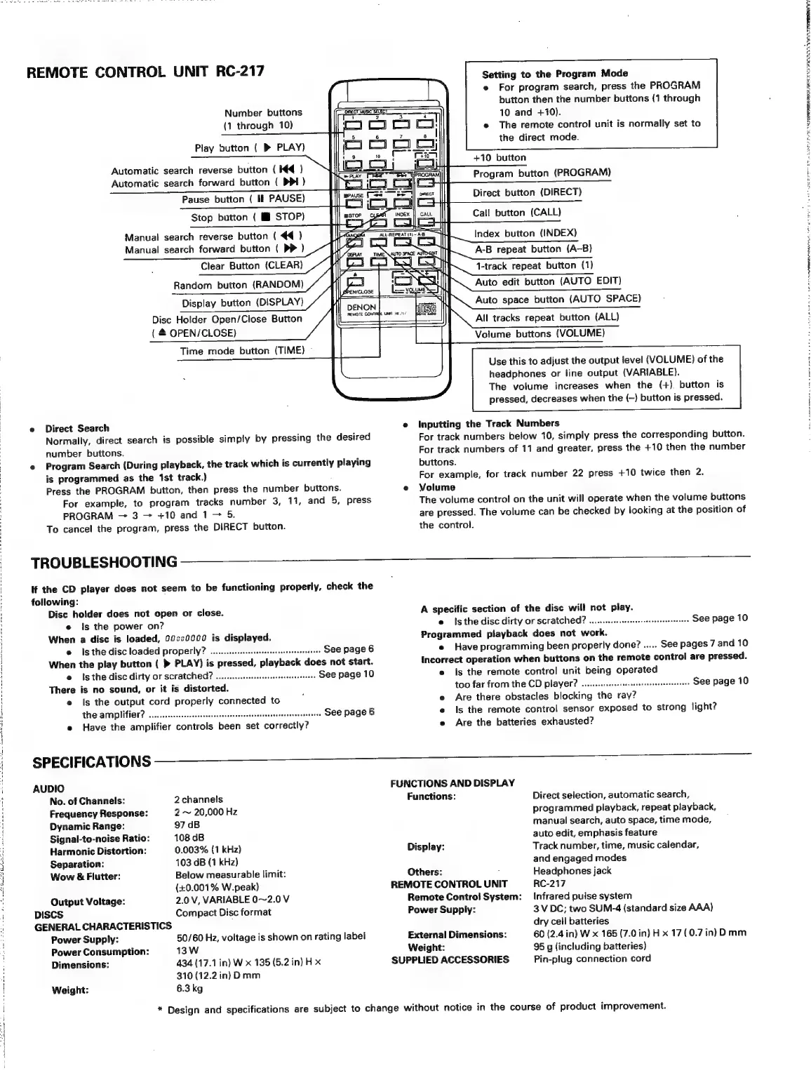 Denon DCD-1420 - Troubleshooting; Common Playback, Program, and Remote Issues; Connection and Amplifier Issues; Technical Specifications