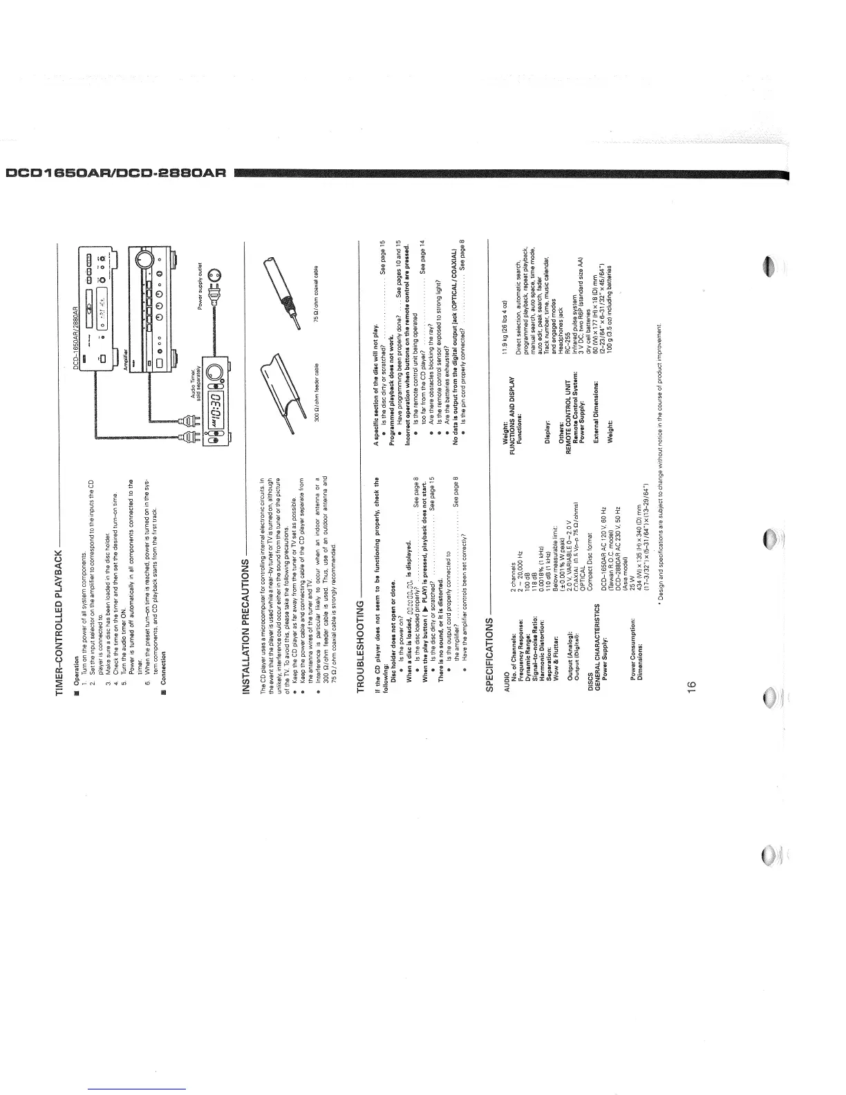 Denon DCD-1650AR - Timer-Controlled Playback; Installation Precautions; Troubleshooting; Specifications