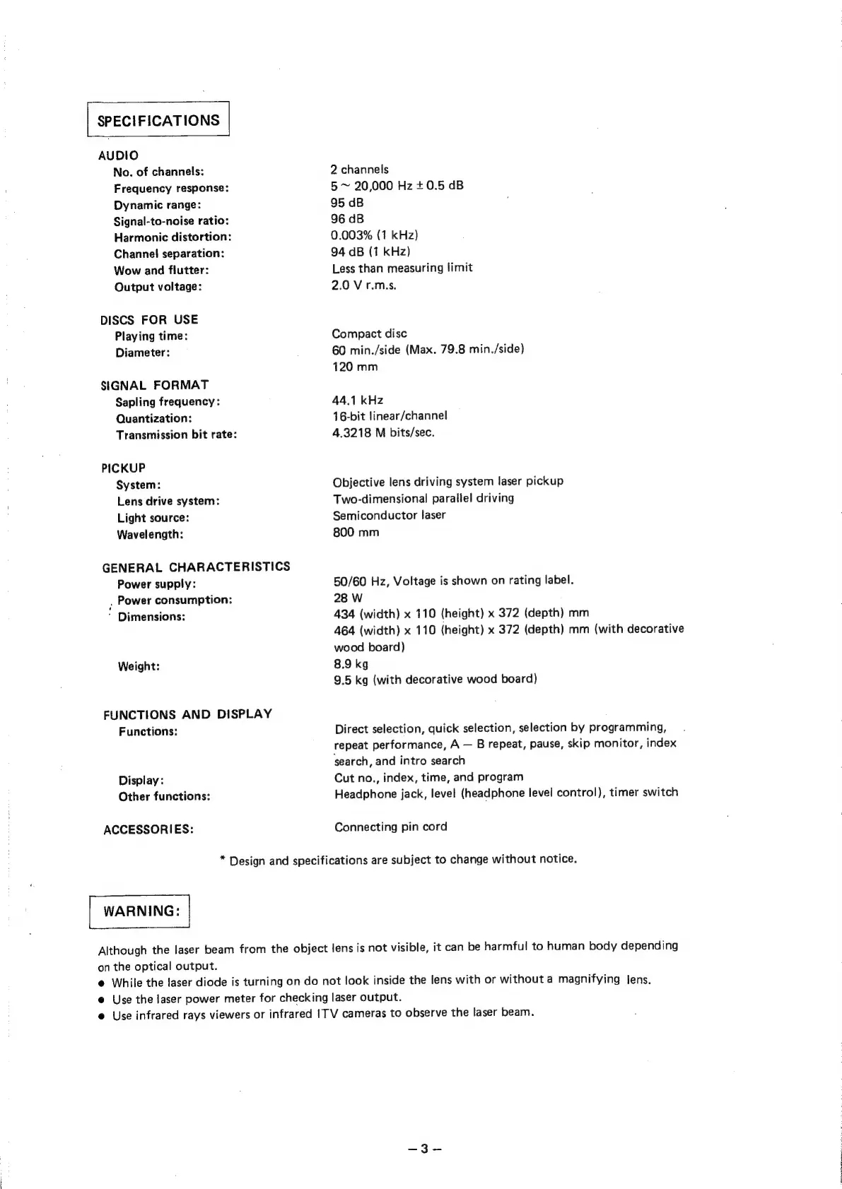 Denon DCD-1800 - Signal Format; General Characteristics; Functions and Display