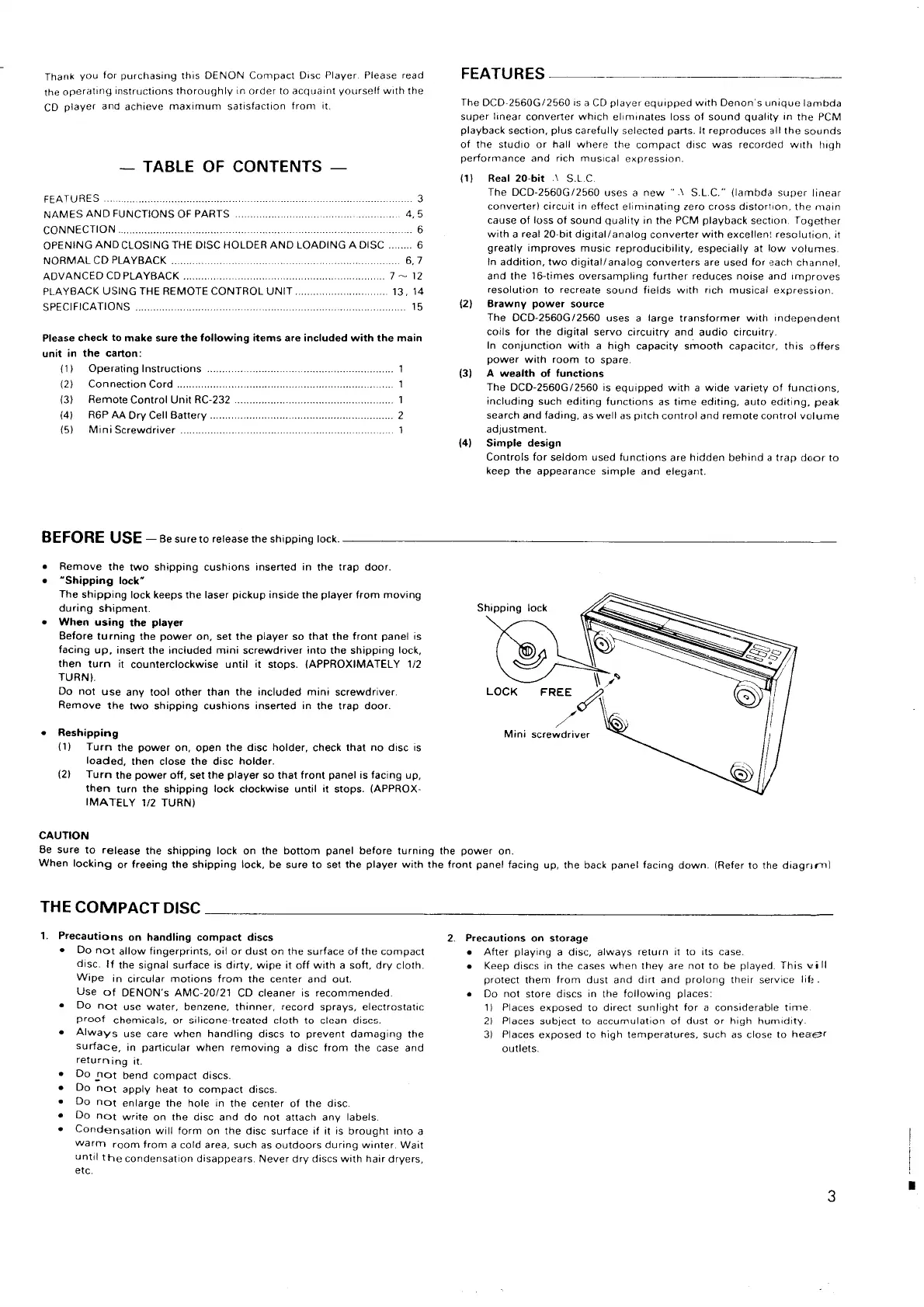 Denon DCD-2560 - Product Features Overview; Denon DCD-2560 G;2560 Highlights; Preparation for Initial Use; Compact Disc Handling Guidelines