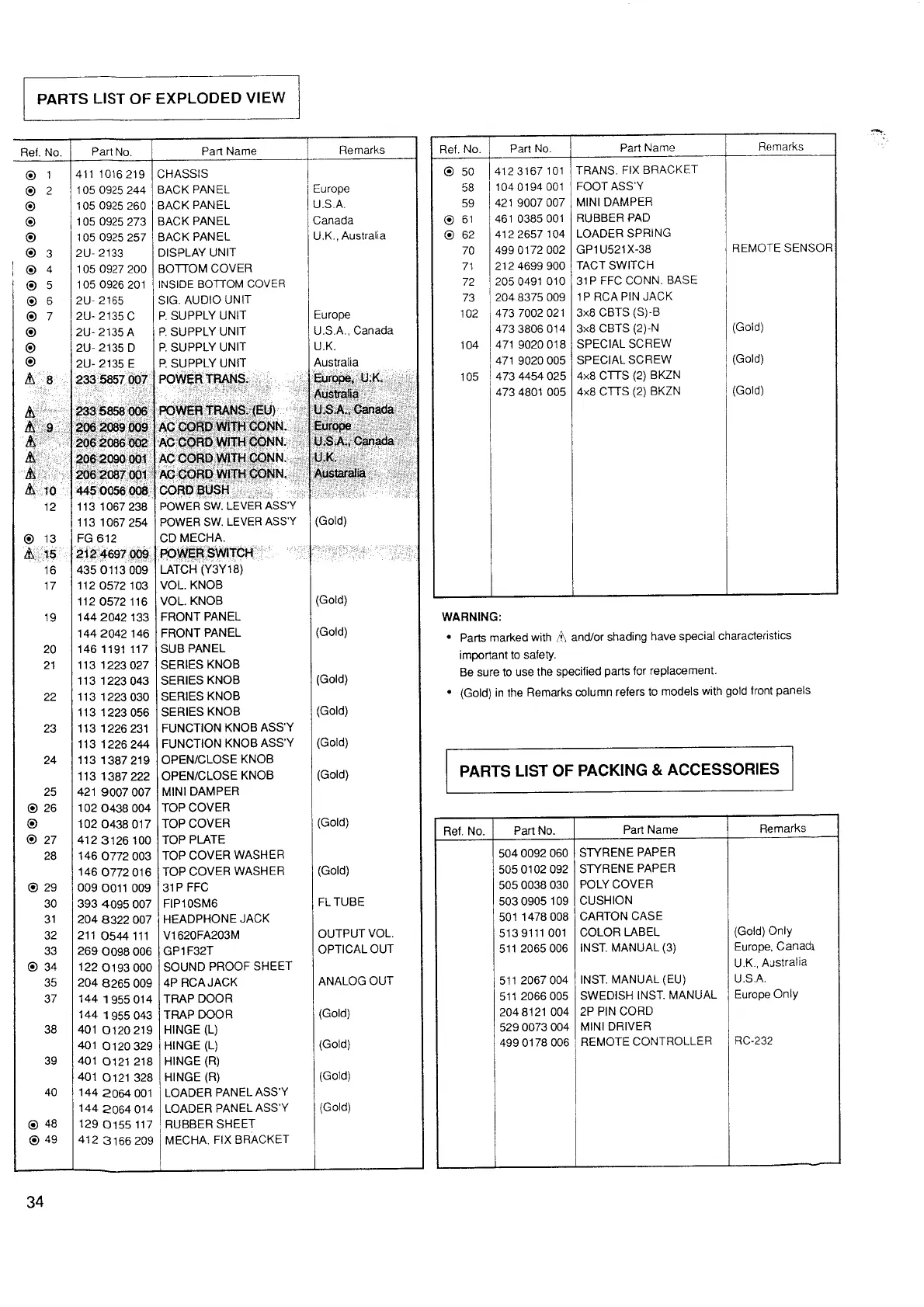 Denon DCD-2560 - Parts List of Exploded View; Chassis and Main Unit Components; Packing and Accessories List