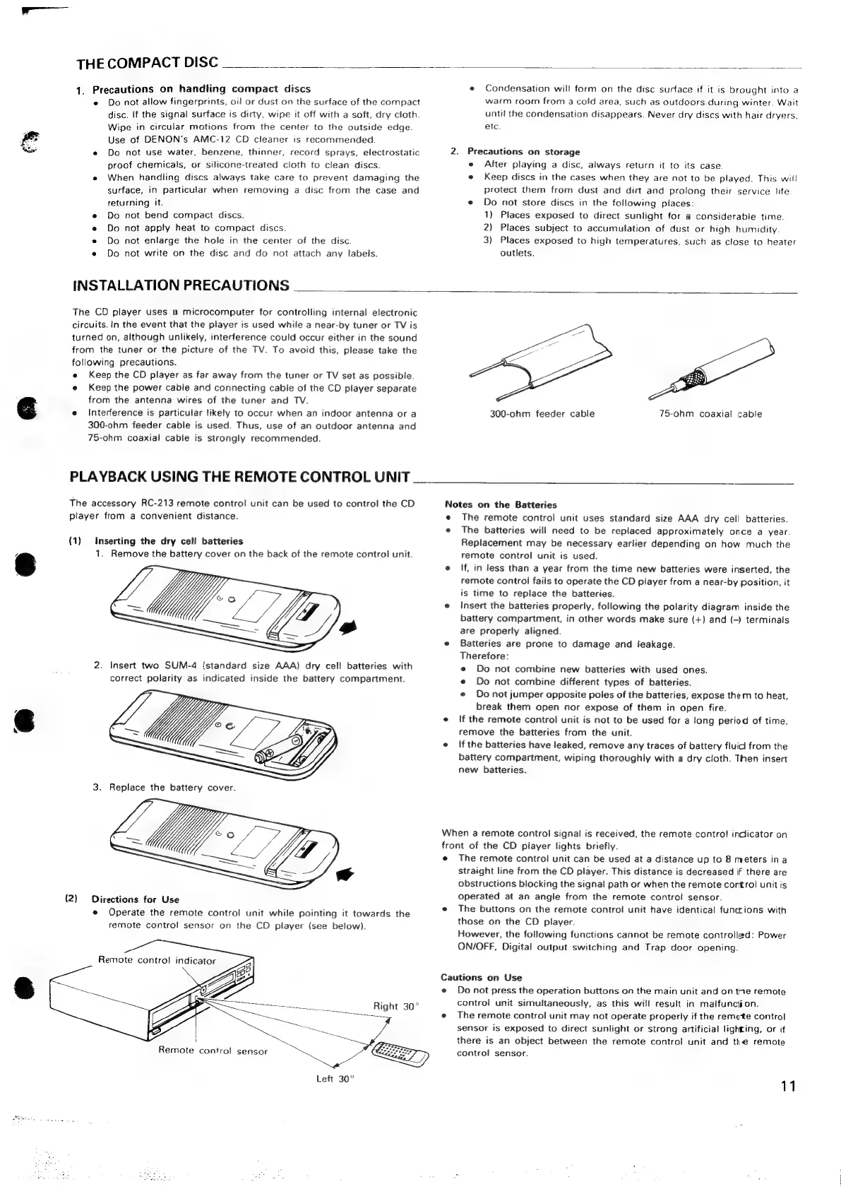 Denon DCD-3520 - Disc Care and Installation; Installation Interference Prevention; Remote Control Unit Operation; Battery Installation and Usage