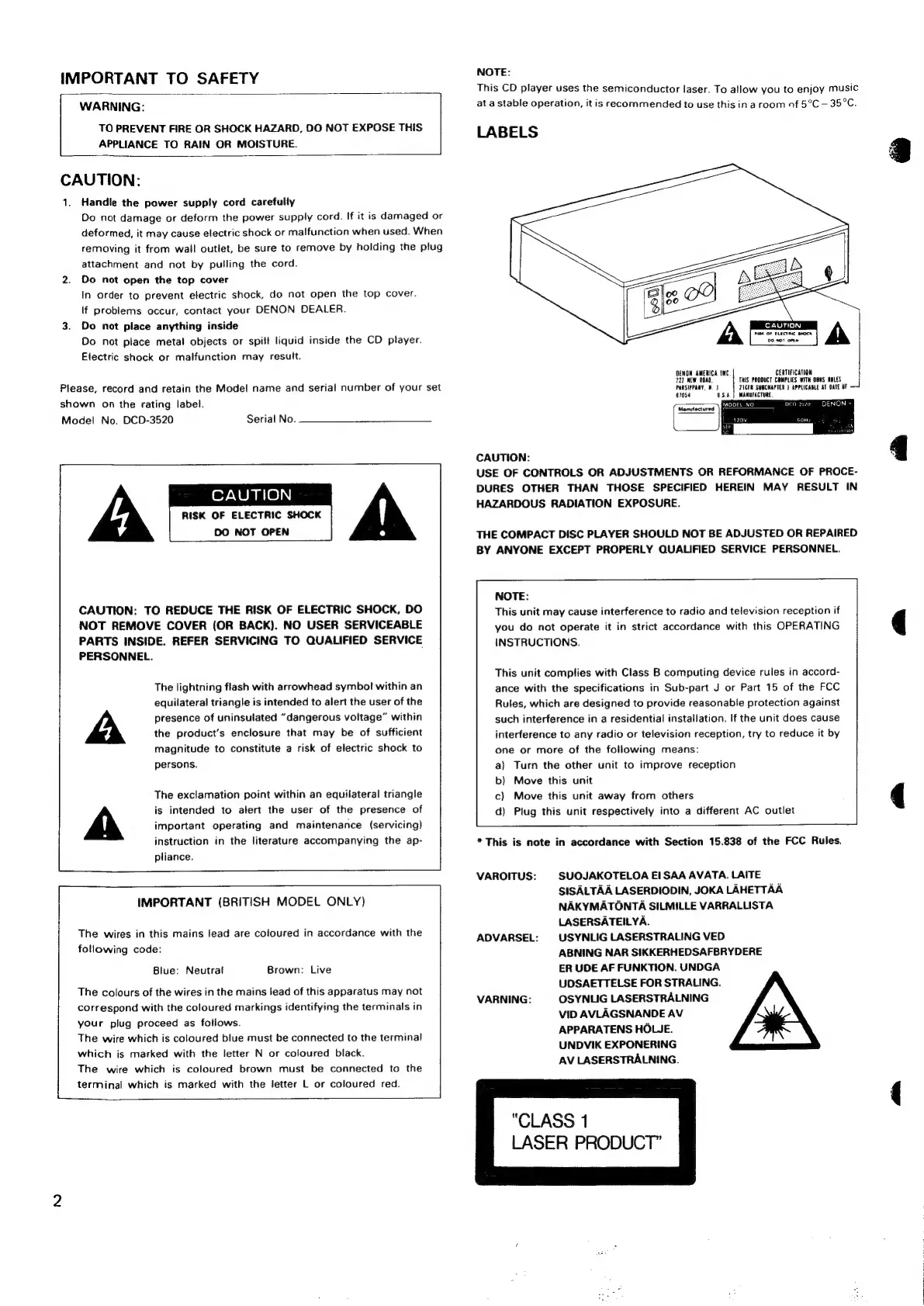 Denon DCD-3520 - Critical Safety Information; General Safety Precautions and Labels