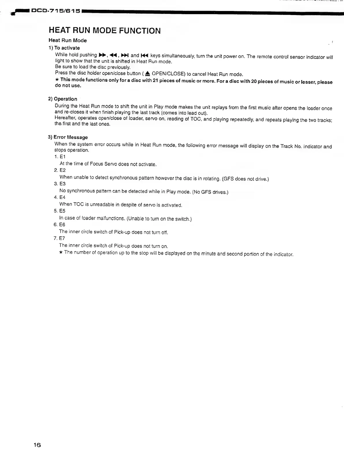 Denon DCD-615 - HEAT RUN MODE FUNCTION; Activating Heat Run Mode; Heat Run Mode Operation; Heat Run Mode Error Messages