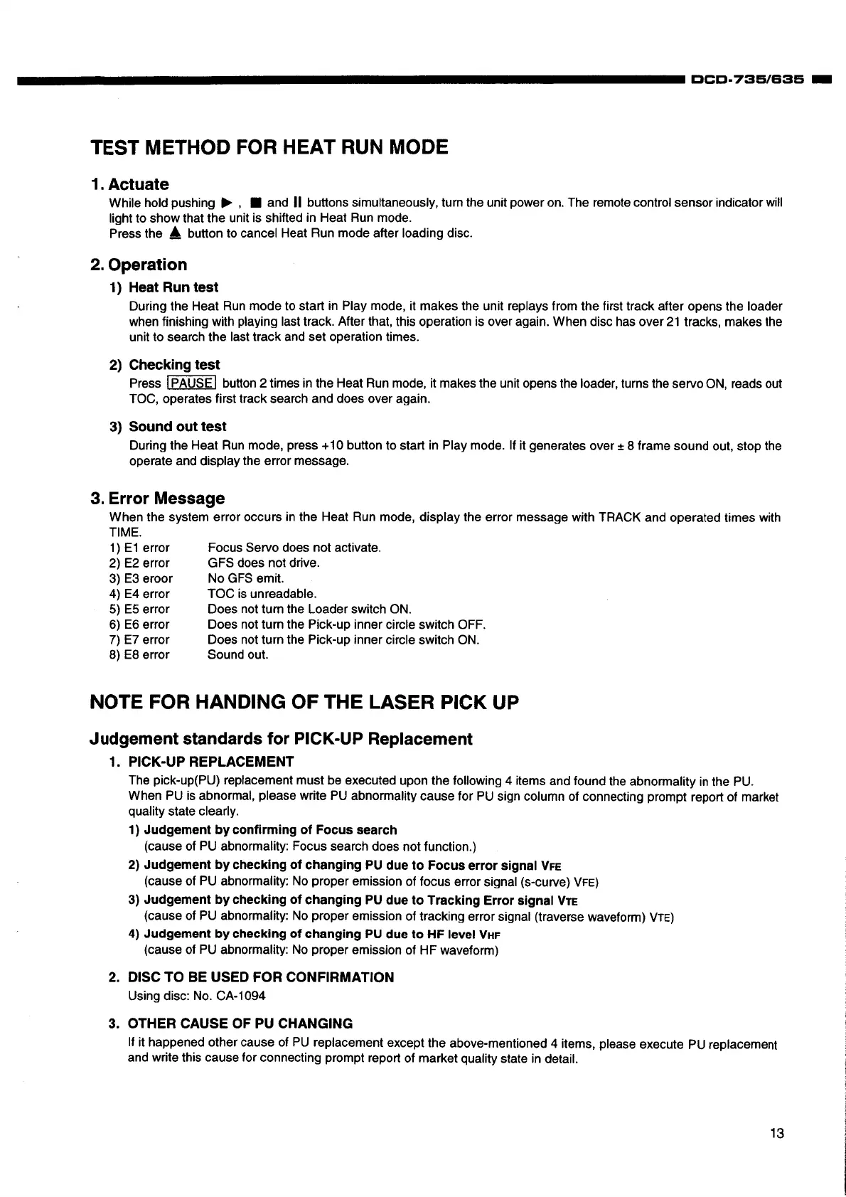 Denon DCD-635 - Test Method for Heat Run Mode; Heat Run Test Activation and Operation; Error Messages and Pick-up Handling