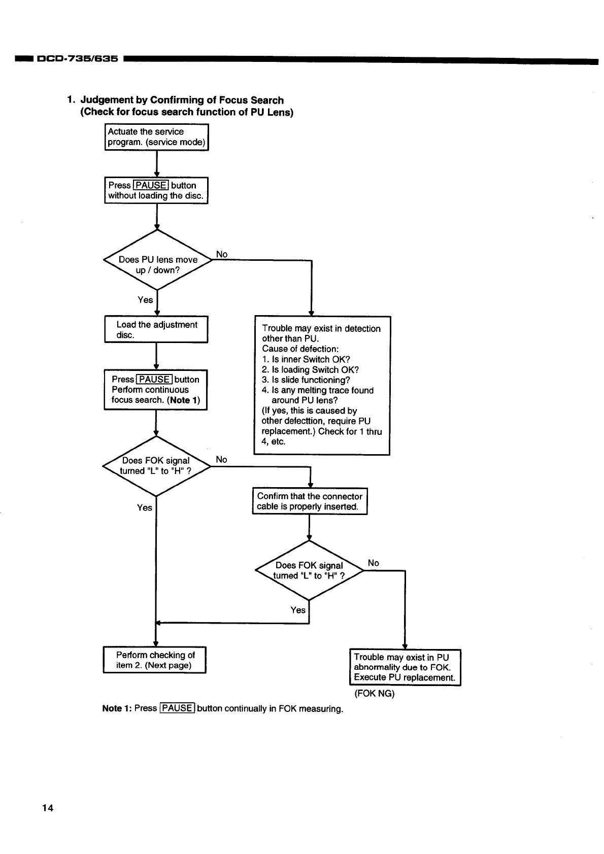 Denon DCD-635 - Laser Pick-up Diagnostics; Focus Search Function Check