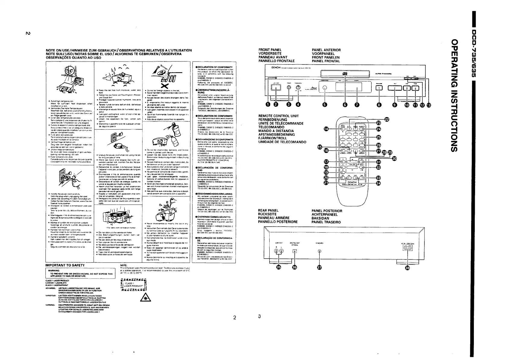Denon DCD-635 - Operating Instructions; Front Panel; Remote Control Unit; Rear Panel