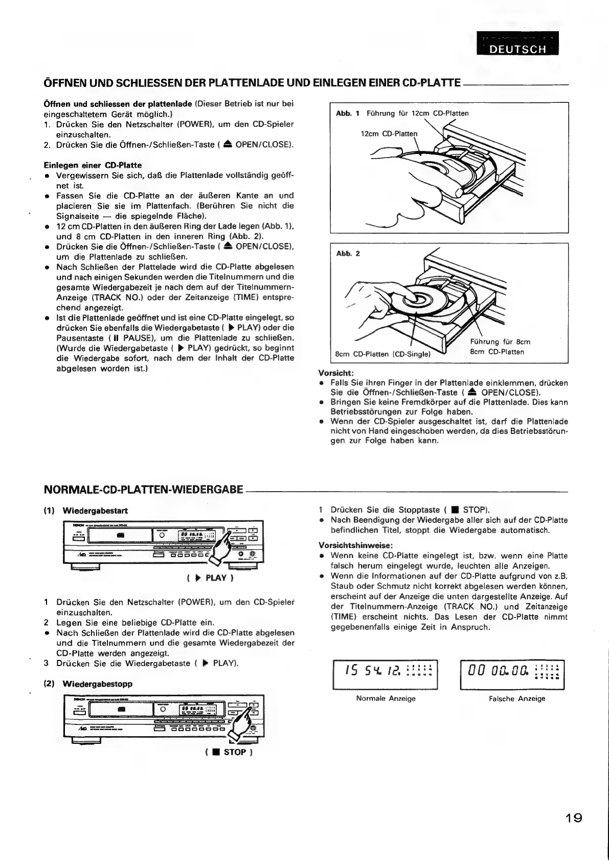 Denon DCD-695 - Offnen und Schliessen der Plattenlade; Und Einlegen einer CD-Platte; Normale CD-Platten-Wiedergabe