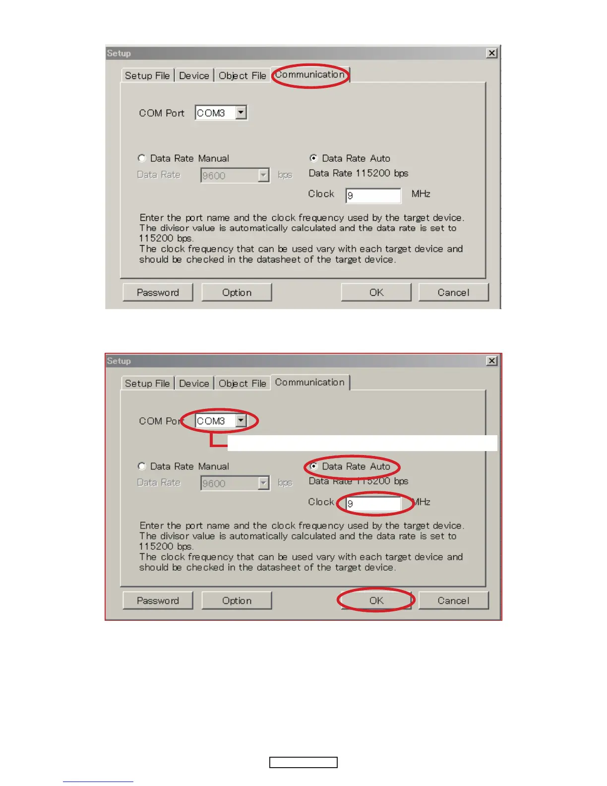 (16) Choose the Serial port number in the COM Port. Check the Data Rate Manual, and input 9 in the Clock.