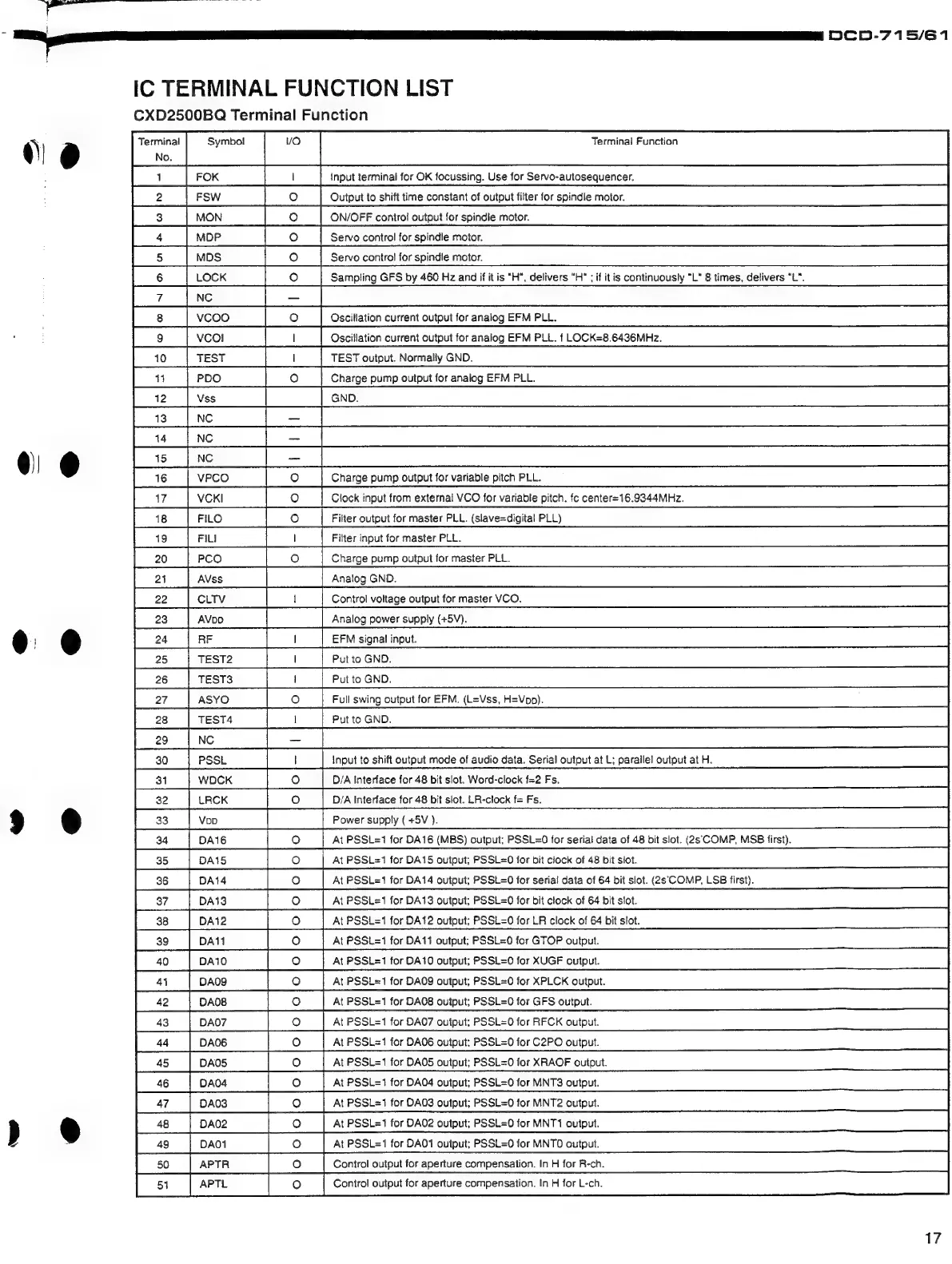 Denon DCD-715 - IC TERMINAL FUNCTION LISTS; CXD2500 BQ Terminal Functions