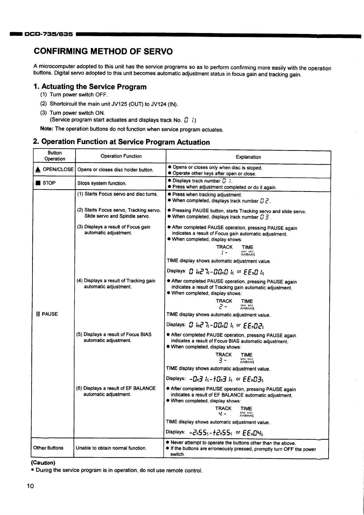 Denon DCD-735 - SERVO CONFIRMATION METHOD; Service Program Activation; Servo Operation Functions