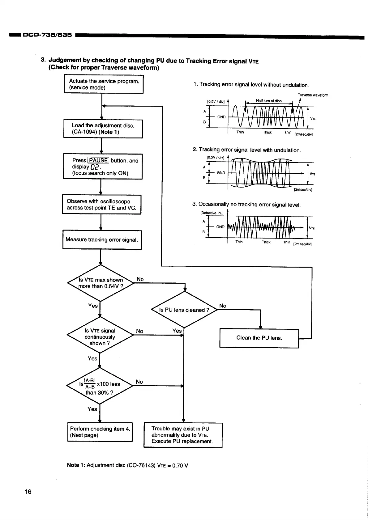 Denon DCD-735 - TRACKING ERROR SIGNAL (VTE) ANALYSIS; VTE Measurement and PU Lens Care