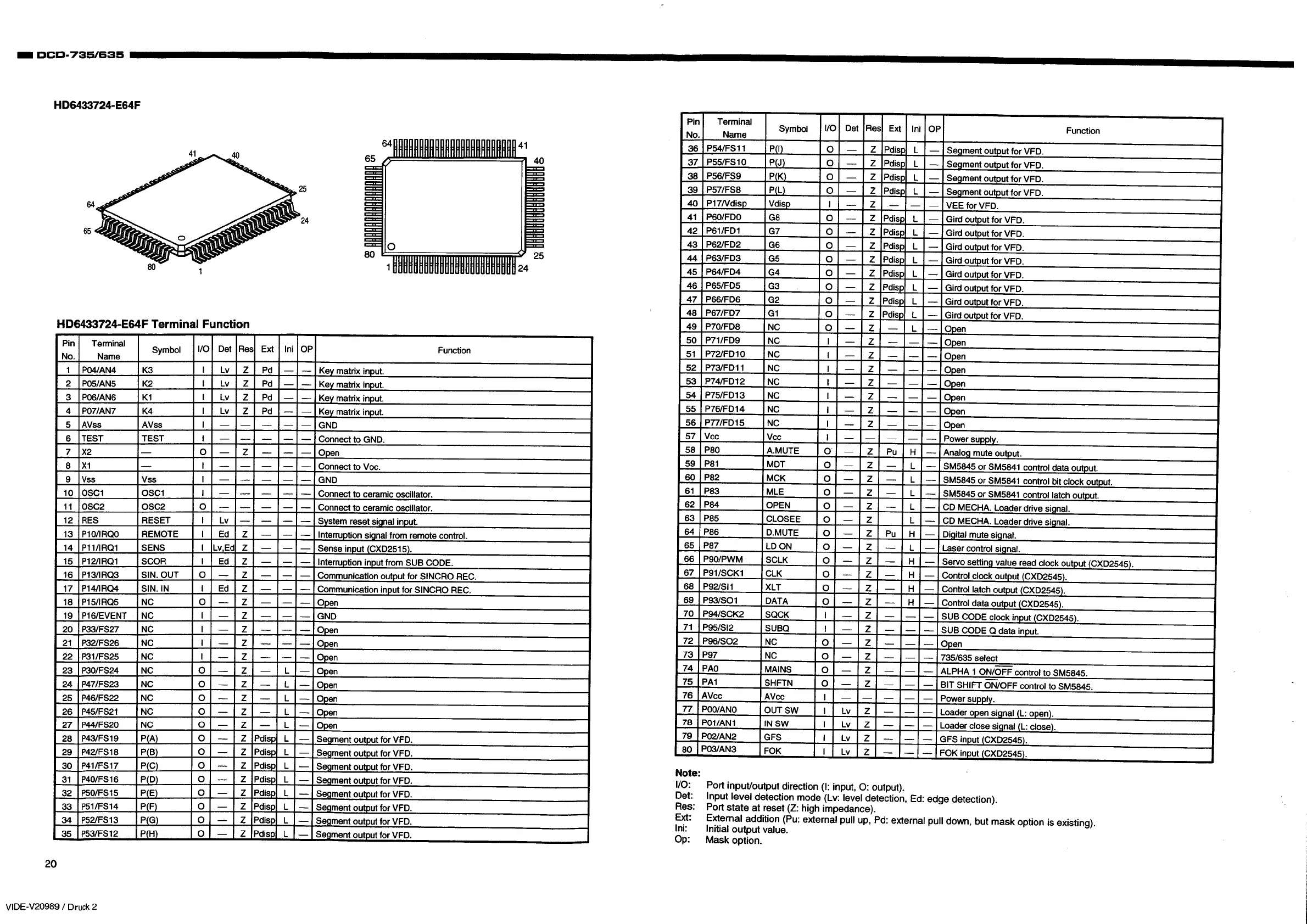 Denon DCD-735 - HD6433724-E64 F IC Pinout and Function