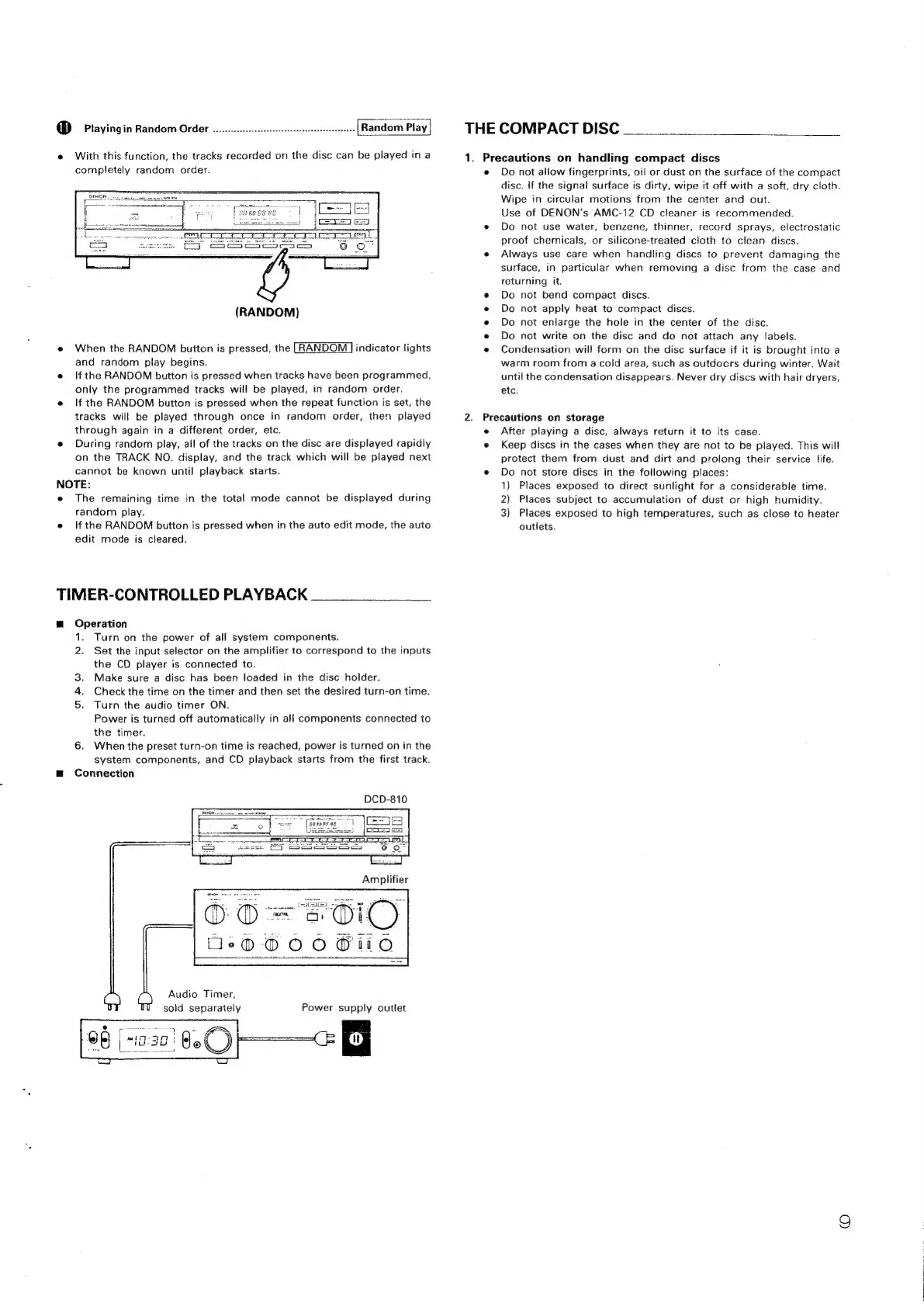 Denon DCD-810 - Random Playback Mode; Compact Disc Care and Storage; Handling Precautions; Storage Guidelines