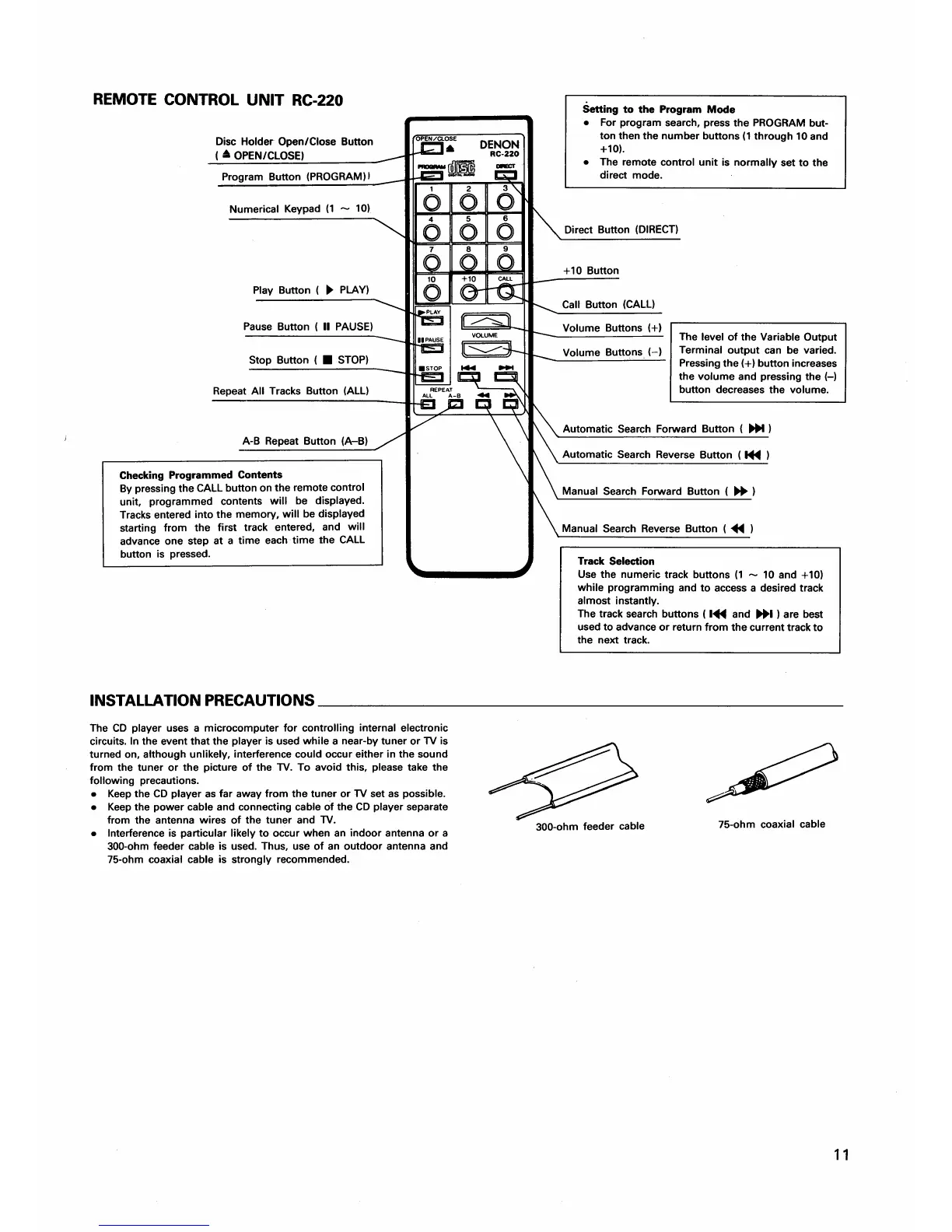 Denon DCD-820 - Remote Control Unit; Installation Precautions