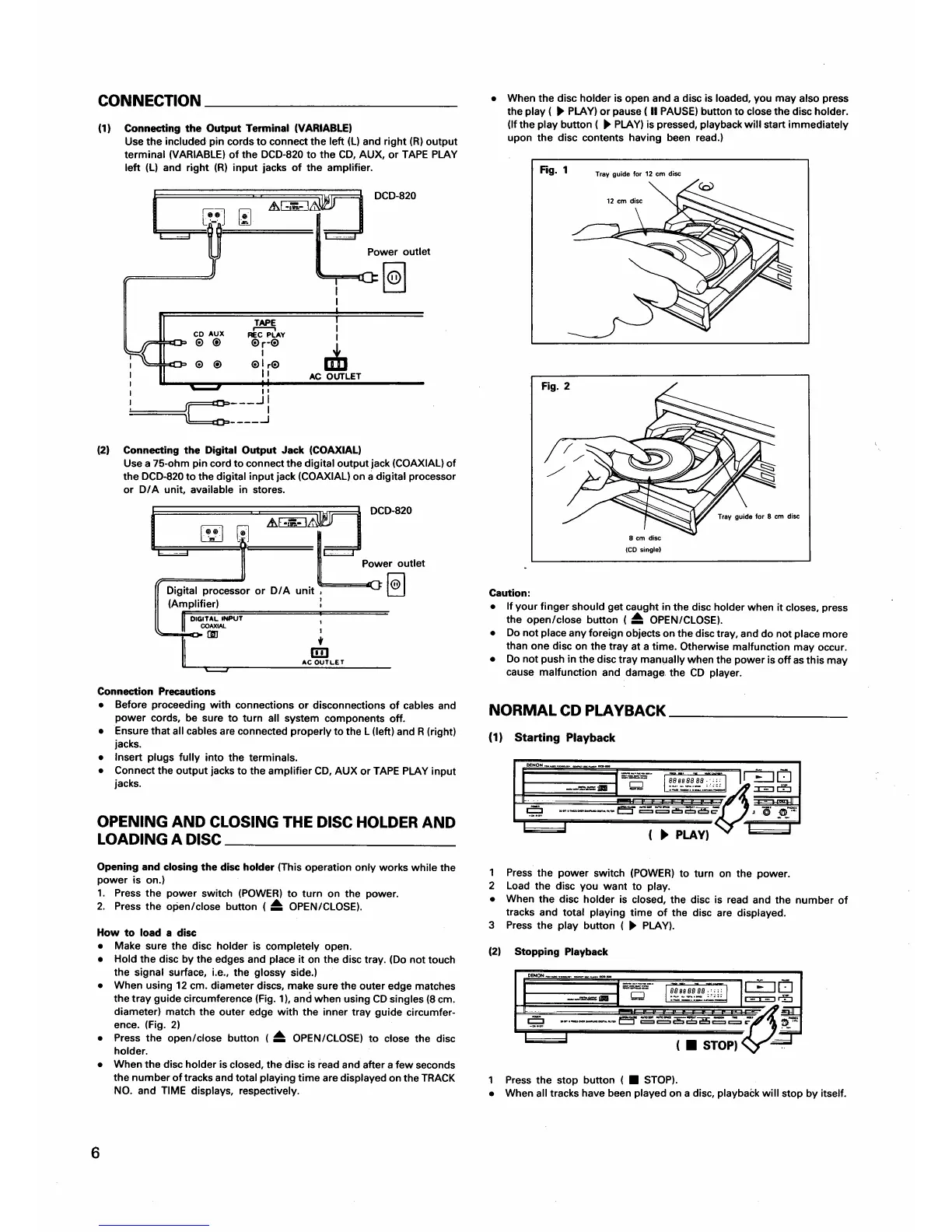 Denon DCD-820 - Connection; Opening and Closing the Disc Holder and Loading a Disc; Connecting the Output Terminal; Connecting the Digital Output Jack