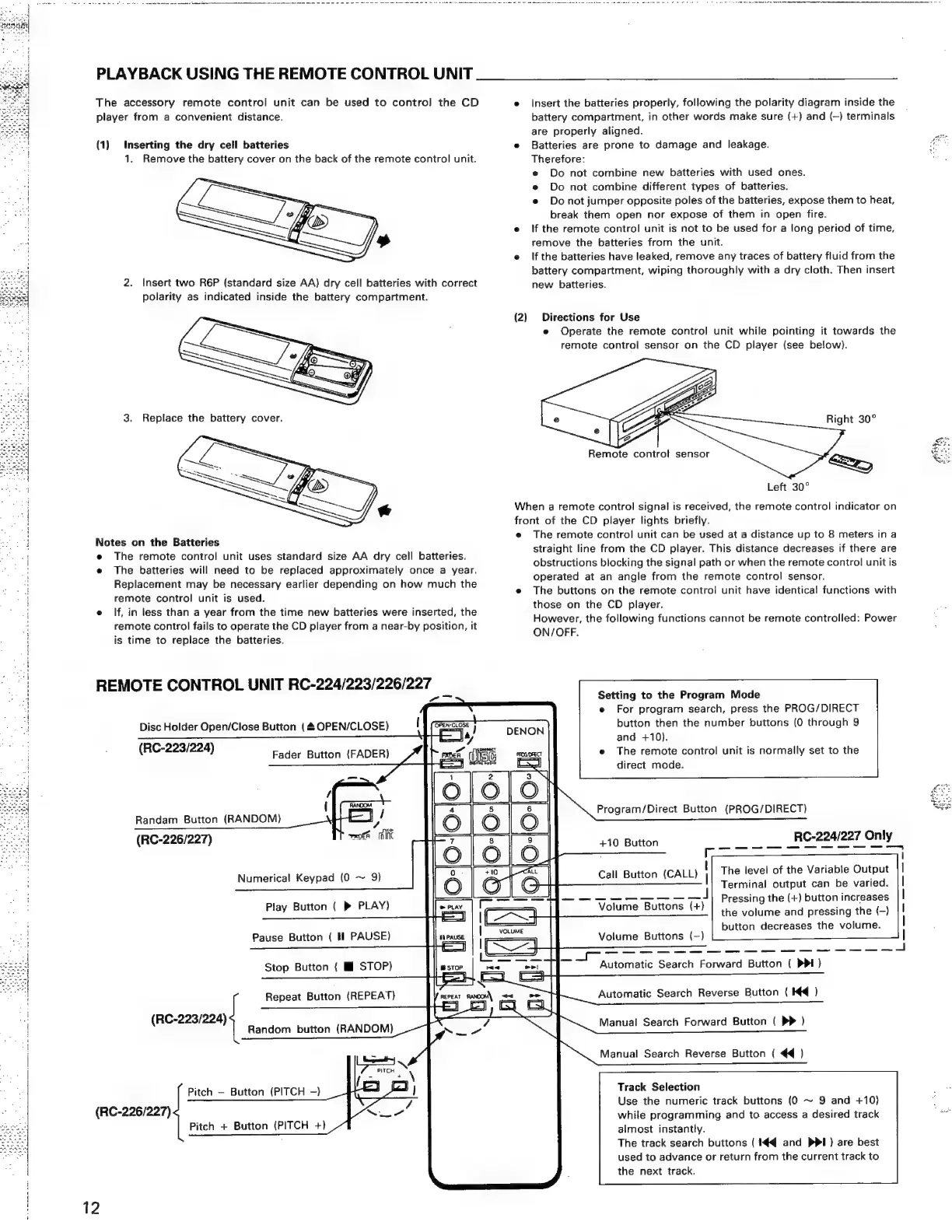 Denon DCD-860 - Remote Control Unit Operation; Battery Installation and Basic Use; Remote Control Functions and Modes