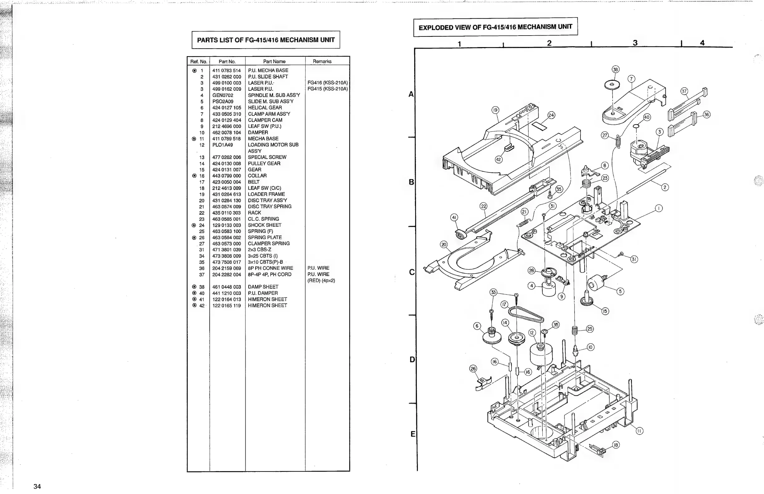 Denon DCD-860 - Mechanism Unit Parts List; FG-415;416 Mechanism Components; FG-415;416 Mechanism Exploded View