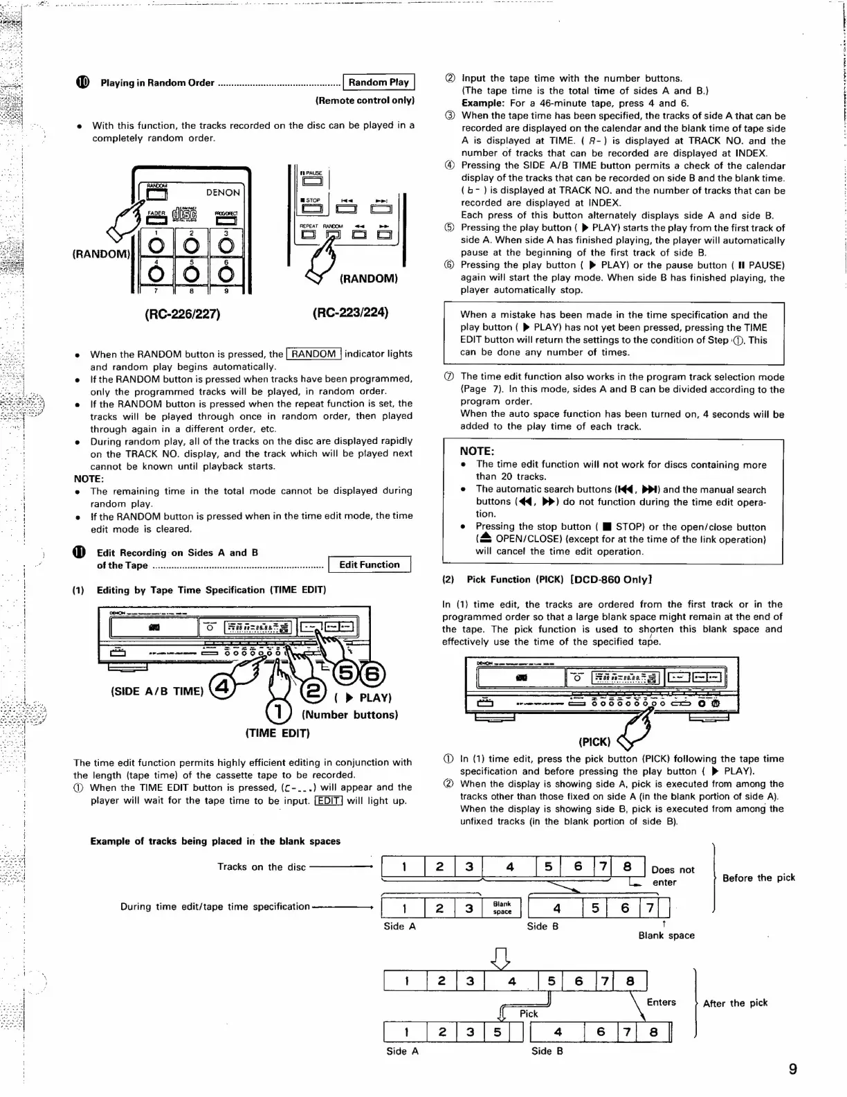 Denon DCD-860 - Special Playback and Editing Modes; Random Playback Function; Tape Time Editing Features
