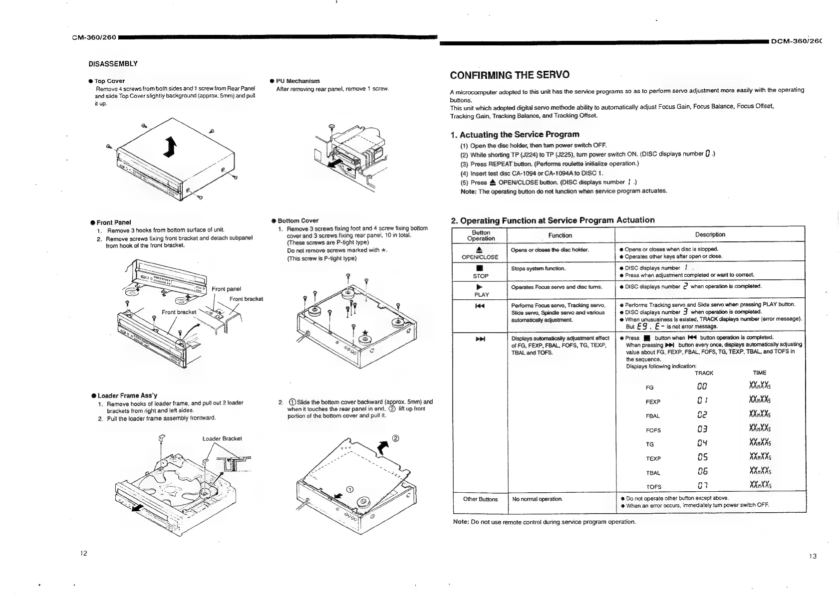Denon DCM-260 - Disassembly Procedures; Unit Disassembly Steps; Servo Adjustment and Confirmation