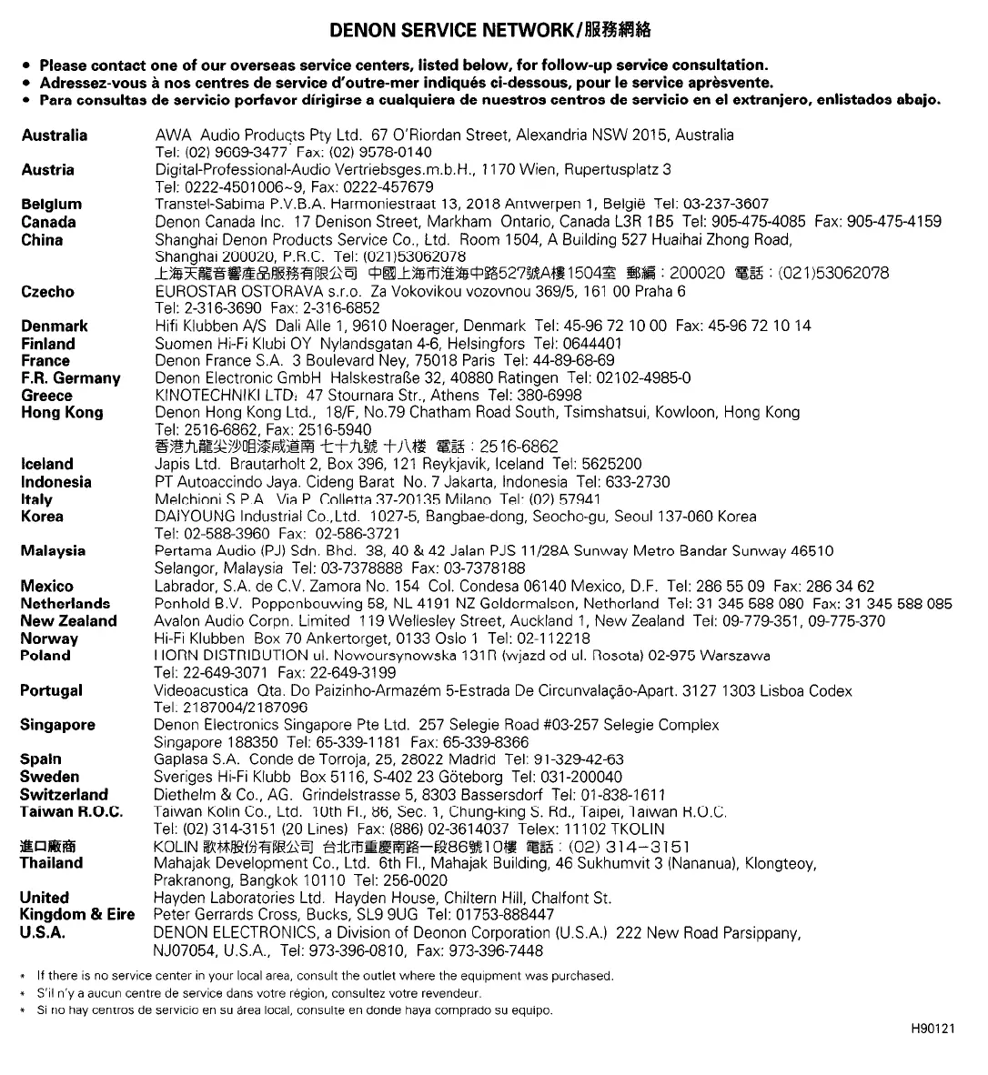 Denon Hong Kong Ltd., 18/F, No.79 Chatham Road South, Tsimshatsui, Kowloon, Hong Kong