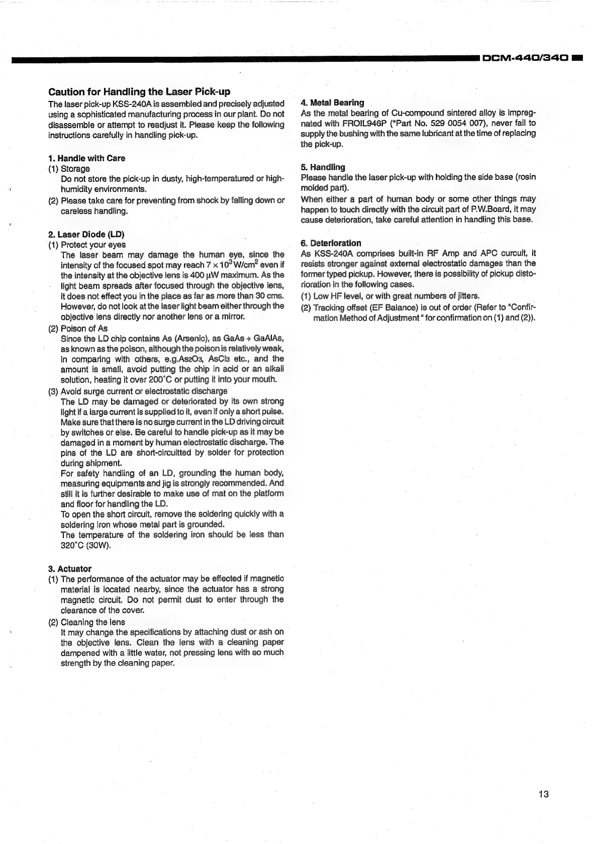Denon DCM-440 - Component Handling Procedures; Laser Diode and Actuator Care