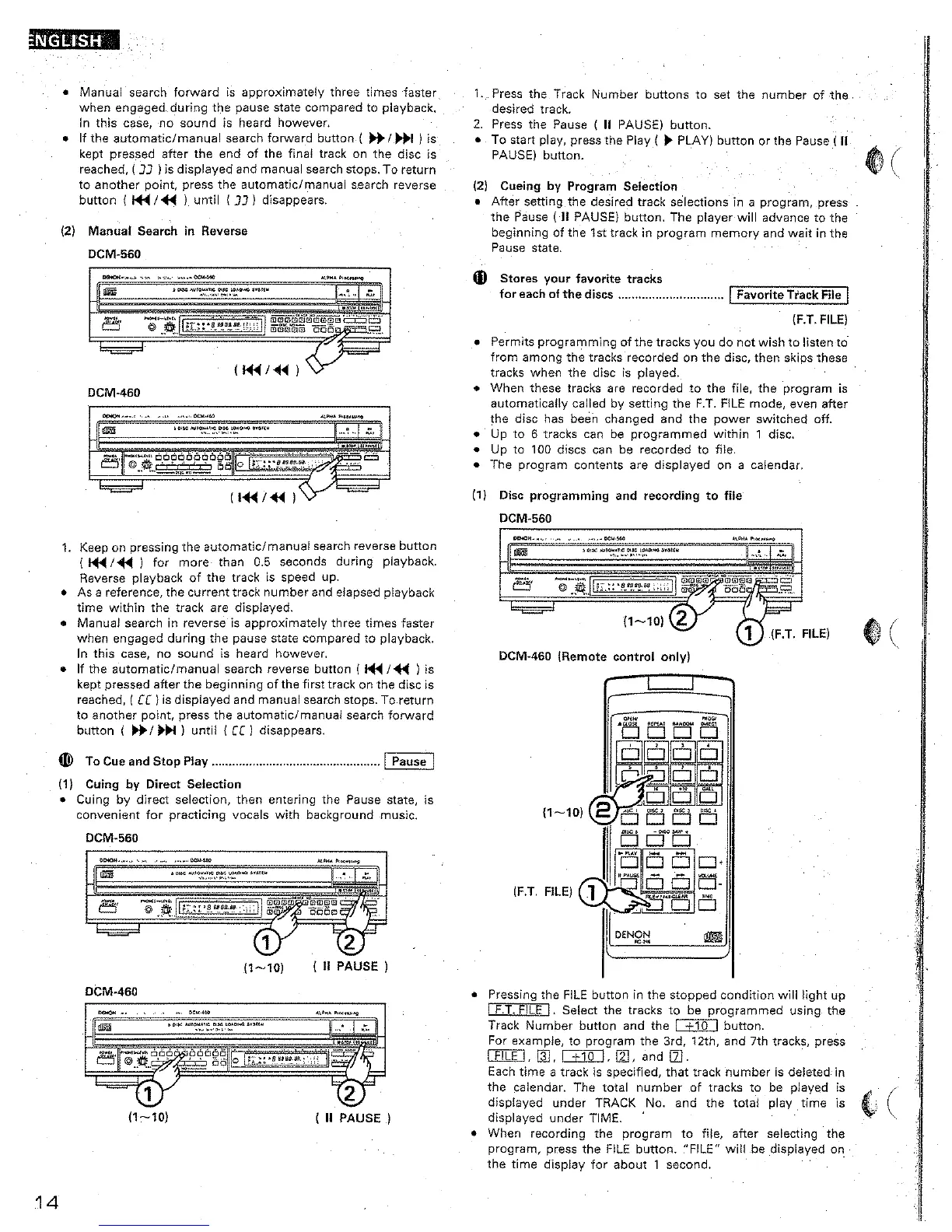 Denon DCM-460 - Manual Search Forward; Manual Search in Reverse; Cue and Stop Play; Favorite Track File (F.T. FILE)