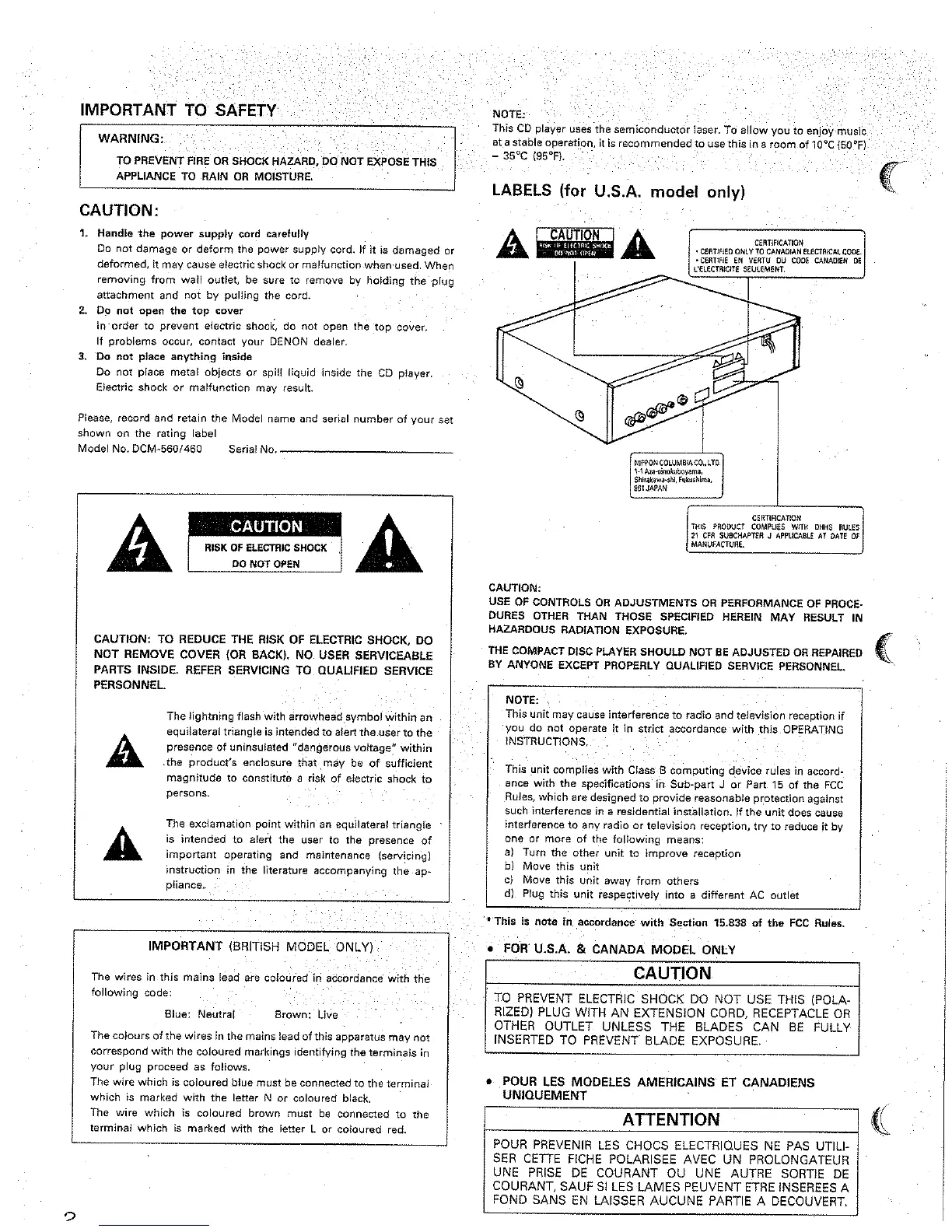 Denon DCM-460 - IMPORTANT TO SAFETY; CAUTION