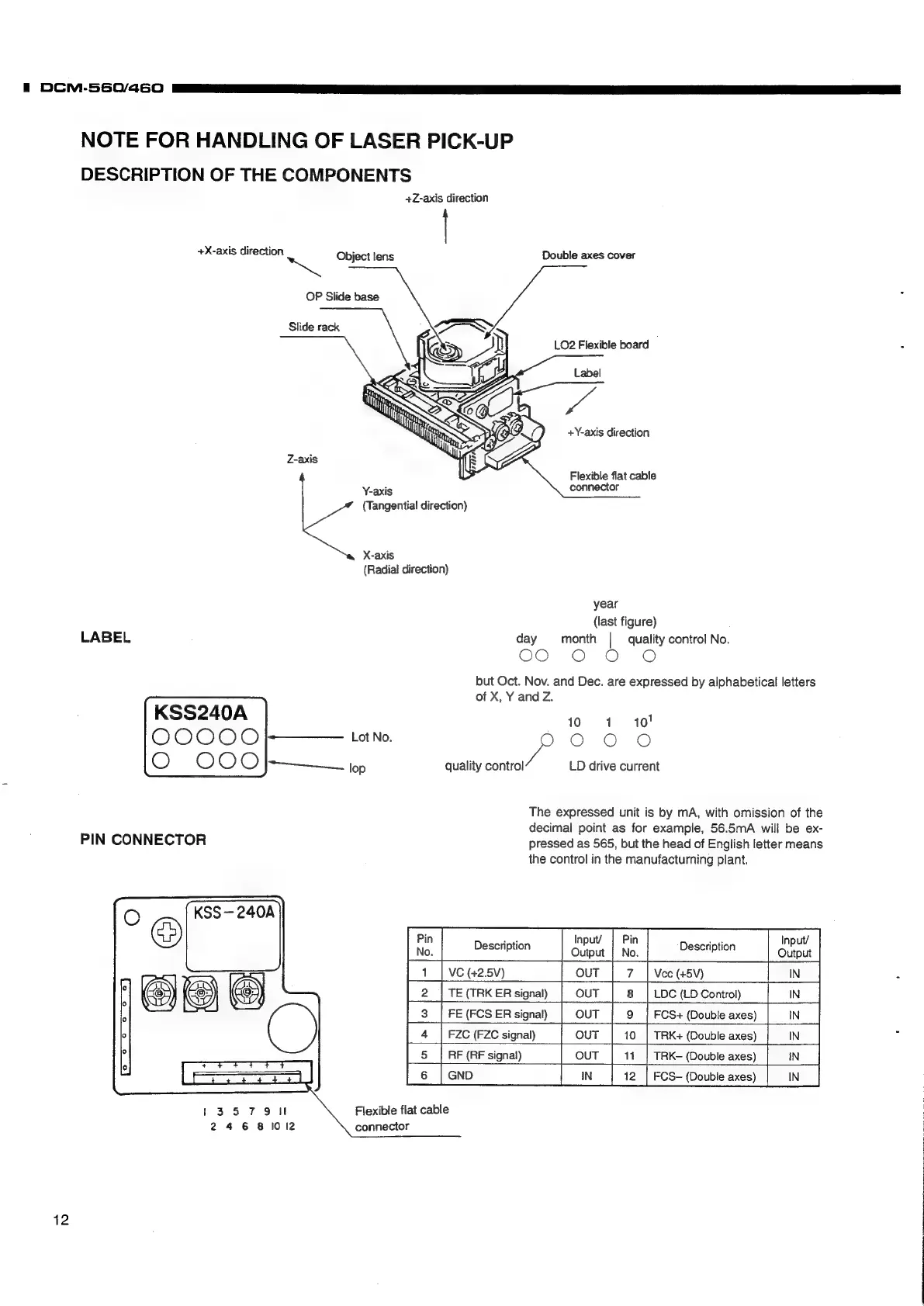 Denon DCM-560 - Laser Pick-up Handling and Description; Laser Pick-up Component Overview; Laser Pick-up Pin Connector Details