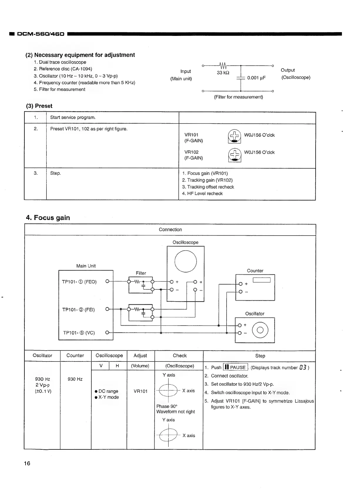 Denon DCM-560 - Adjustment Procedures; Required Equipment and Presets; Focus Gain Adjustment
