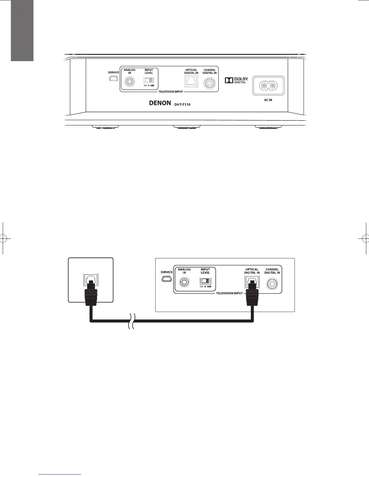 Use the supplied optical cable to connect your television’s optical digital output to DHT-T110’s Optical Digital Input. Other