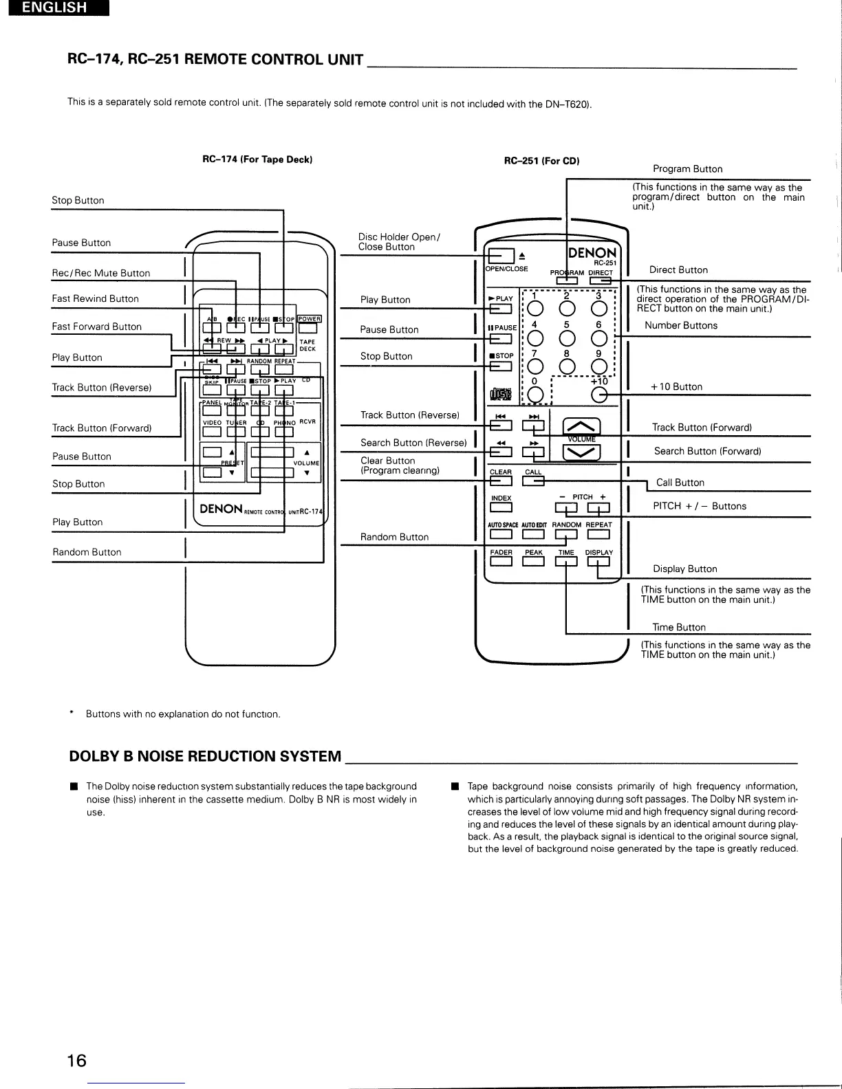 Denon DN-T620 - RC-174, RC-251 Remote Control Unit; Dolby B Noise Reduction System
