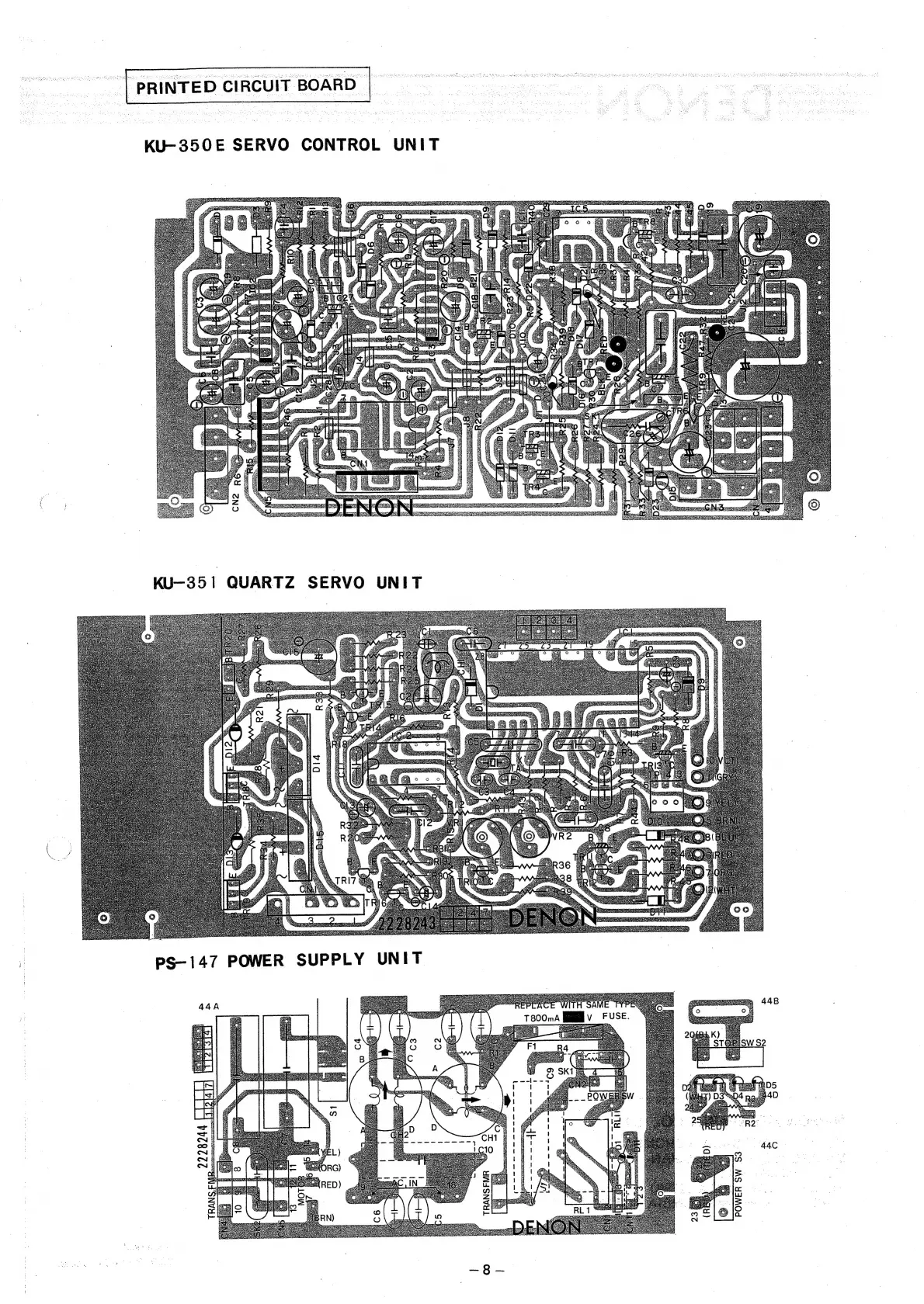Denon DP-75 - Printed Circuit Board; KU-350 E Servo Control Unit PCB Layout; KU-351 Quartz Servo Unit PCB Layout; PS-147 Power Supply Unit PCB Layout