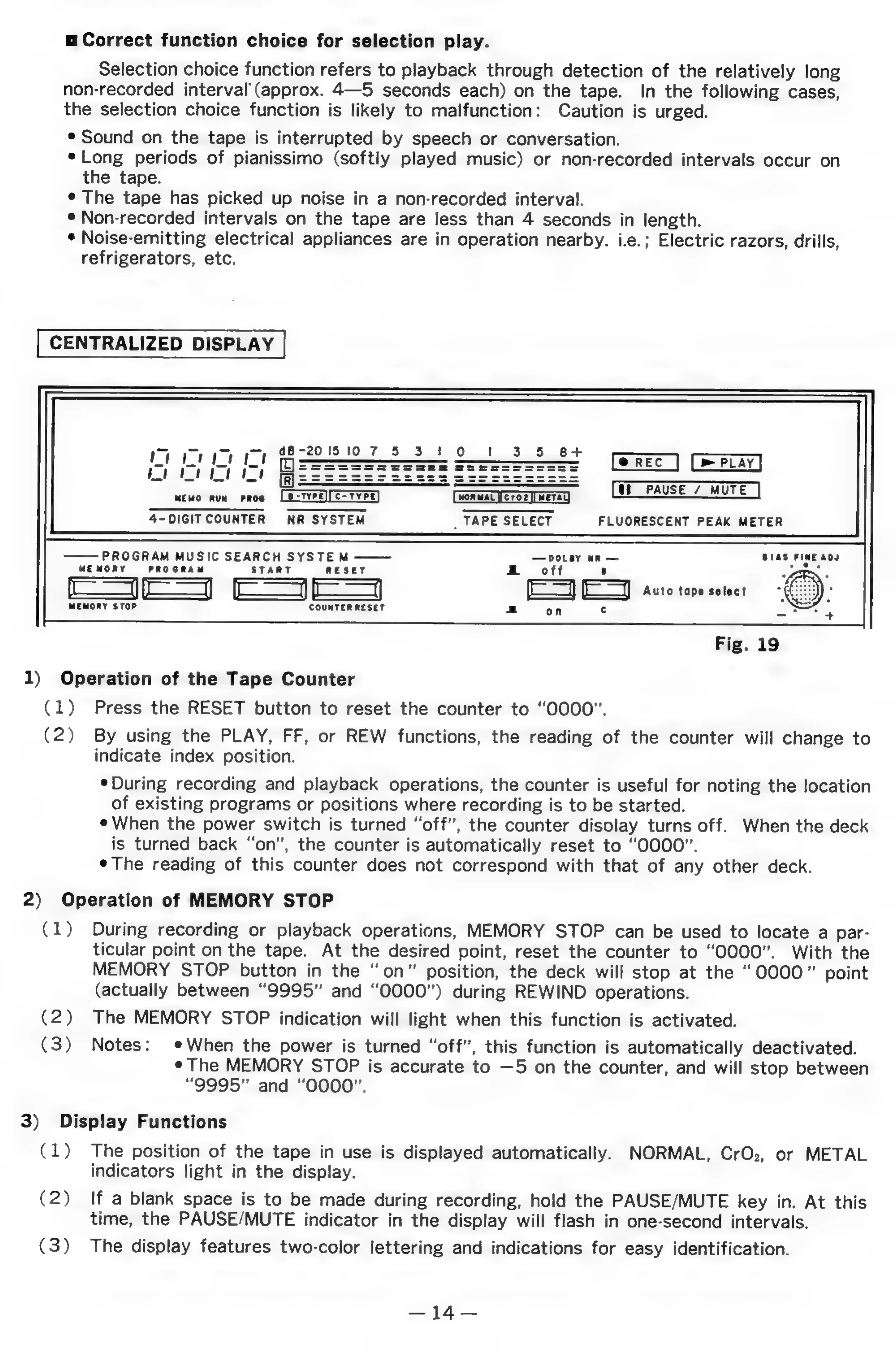 Denon DR-M11 - Centralized Display and Controls; Operation of the Tape Counter; Operation of MEMORY STOP; Display Functions