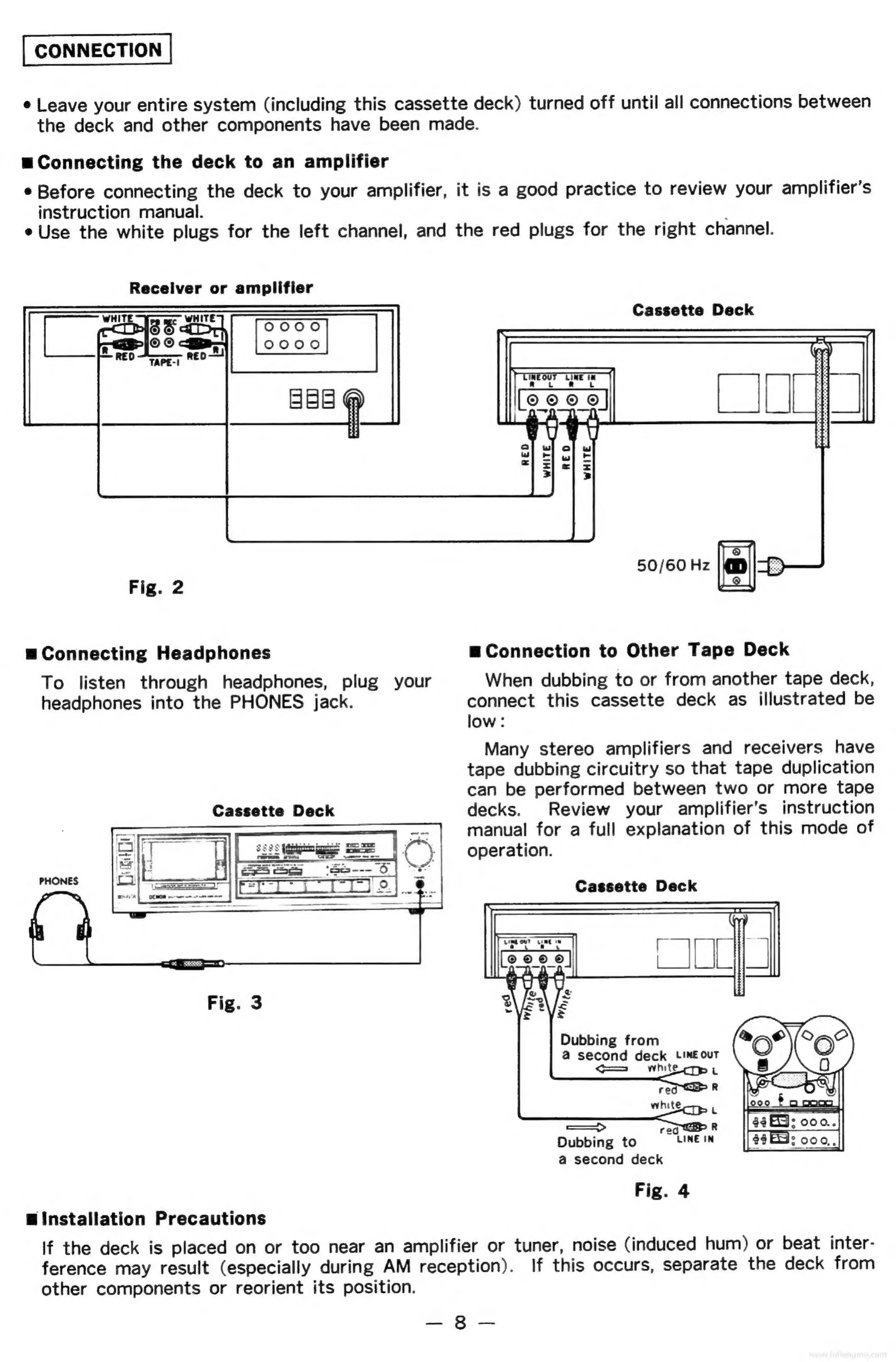 Denon DR-M11 - Connection; Connecting the deck to an amplifier; Connecting Headphones; Connection to Other Tape Deck