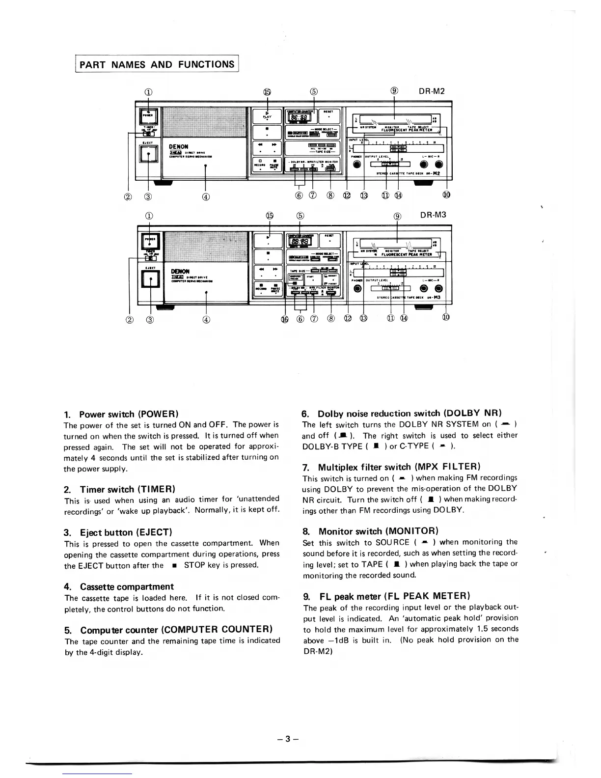 Denon DR-M2 - PART NAMES AND FUNCTIONS; Power switch (POWER); Timer switch (TIMER); Eject button (EJECT)