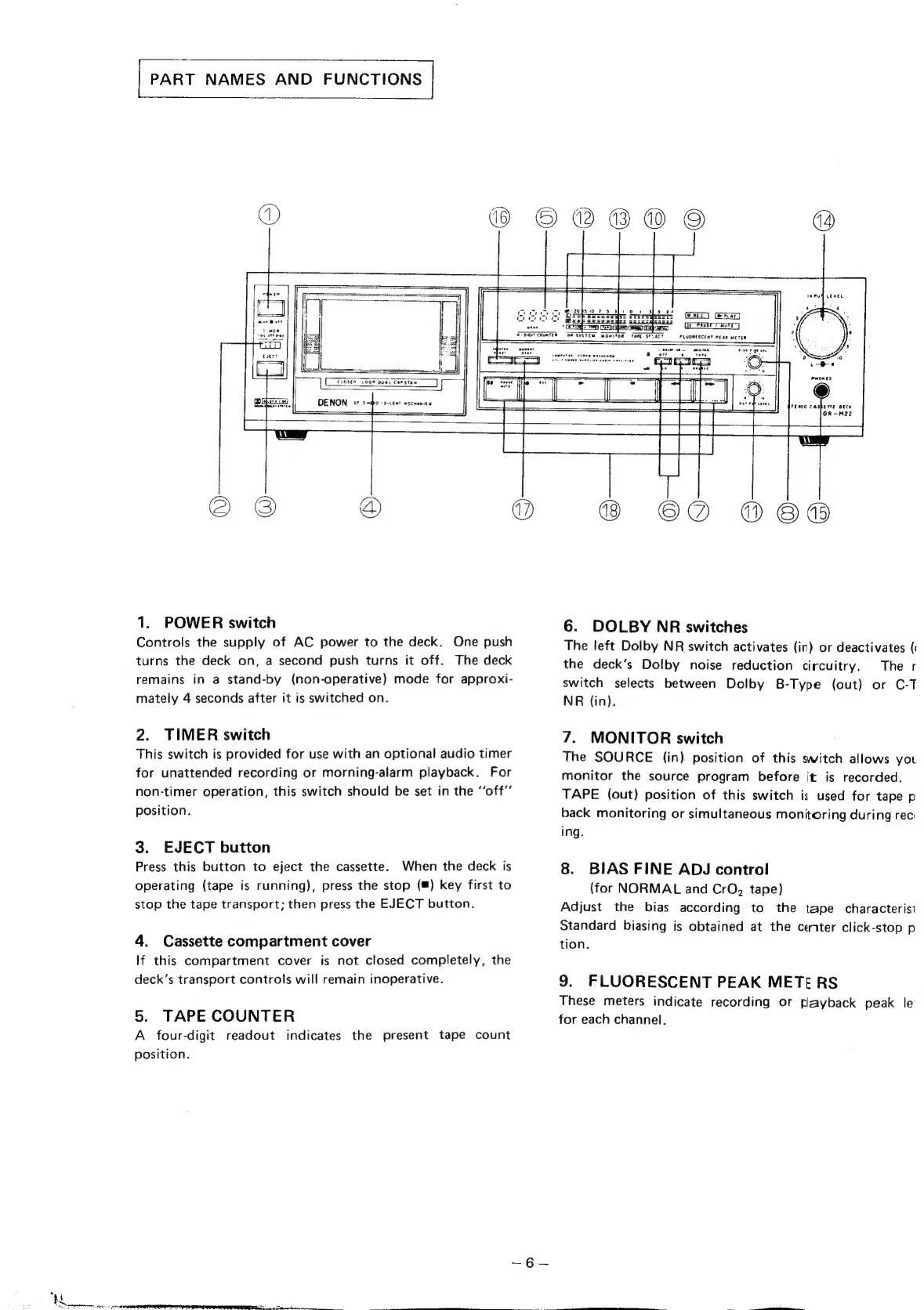 Denon DR-M22 - Component Identification and Functions; POWER switch; TIMER switch; EJECT button