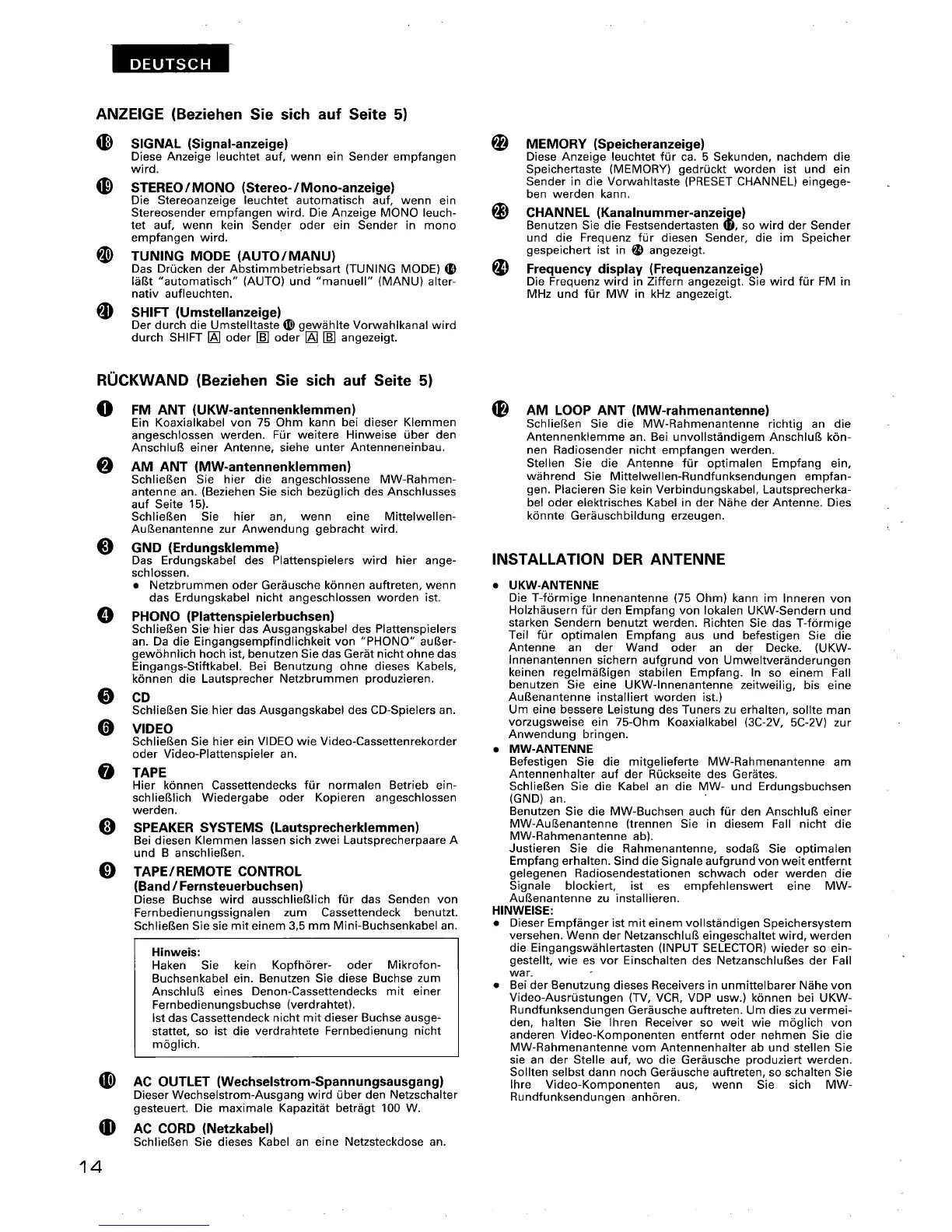 Denon DRA-345R - Display Indicators; Signal and Status Indicators; Memory and Frequency Displays; Rear Panel Connections