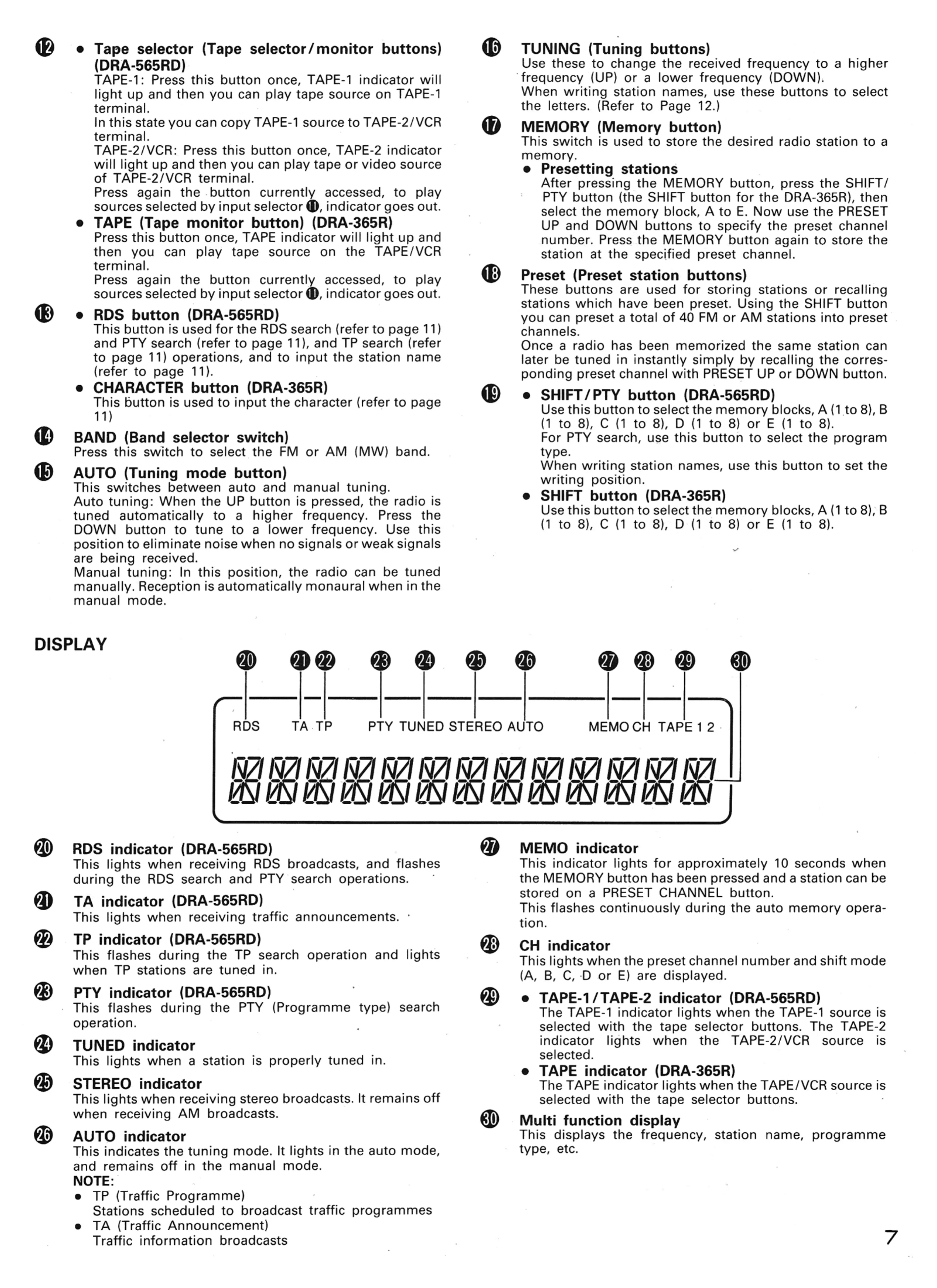 Denon DRA-365R - Front Panel Functions and Indicators; Tape and Monitor Operations; Tuning and Memory Operations