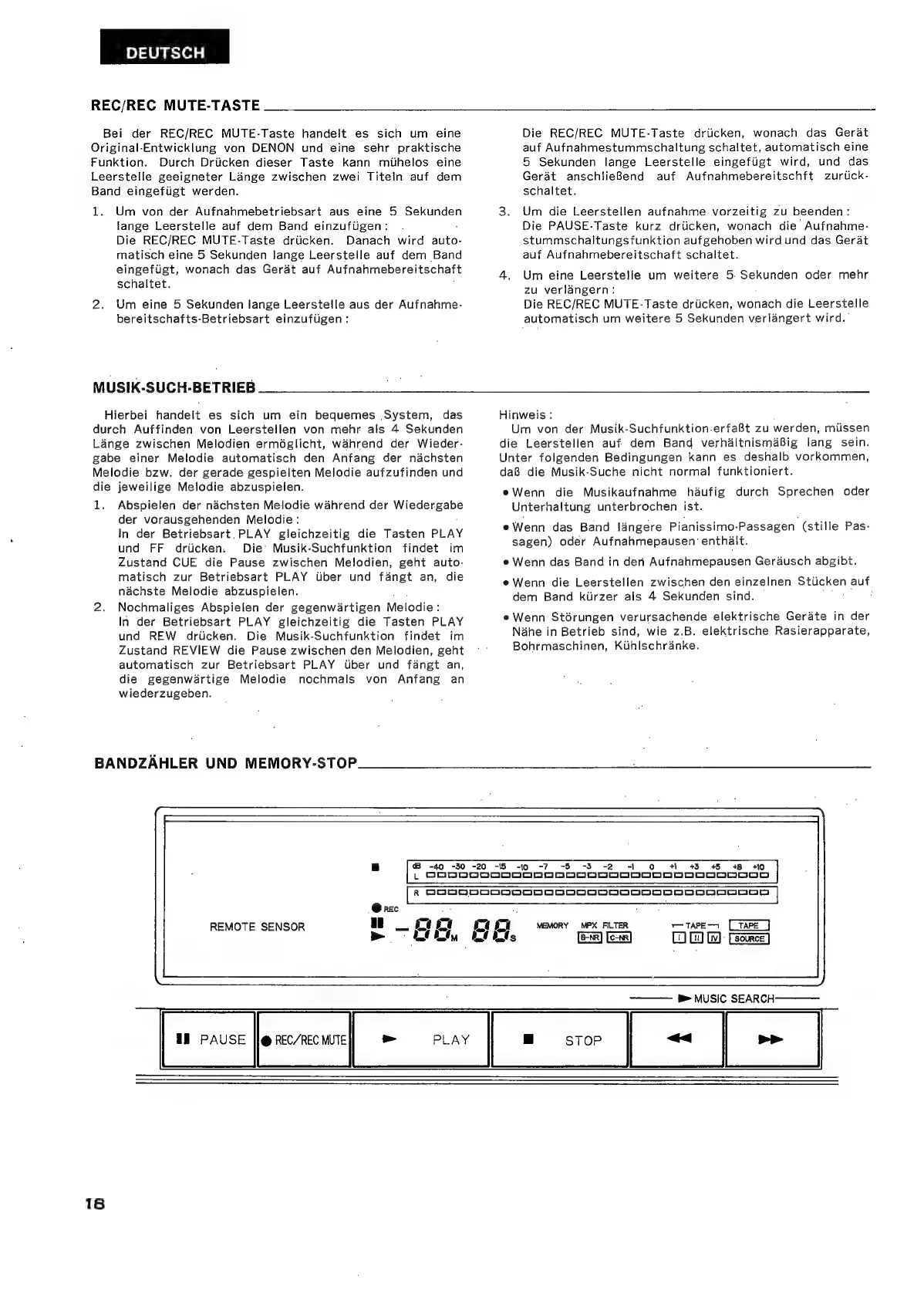 Denon DRM-710 - Rec;Rec Mute-Taste; Musik-Such-Betrieb; Bandzahler und Memory-Stop