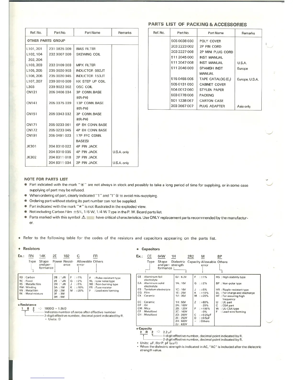 • Refer to the following table for the codes of the resistors and capacitors appearing on the parts list .