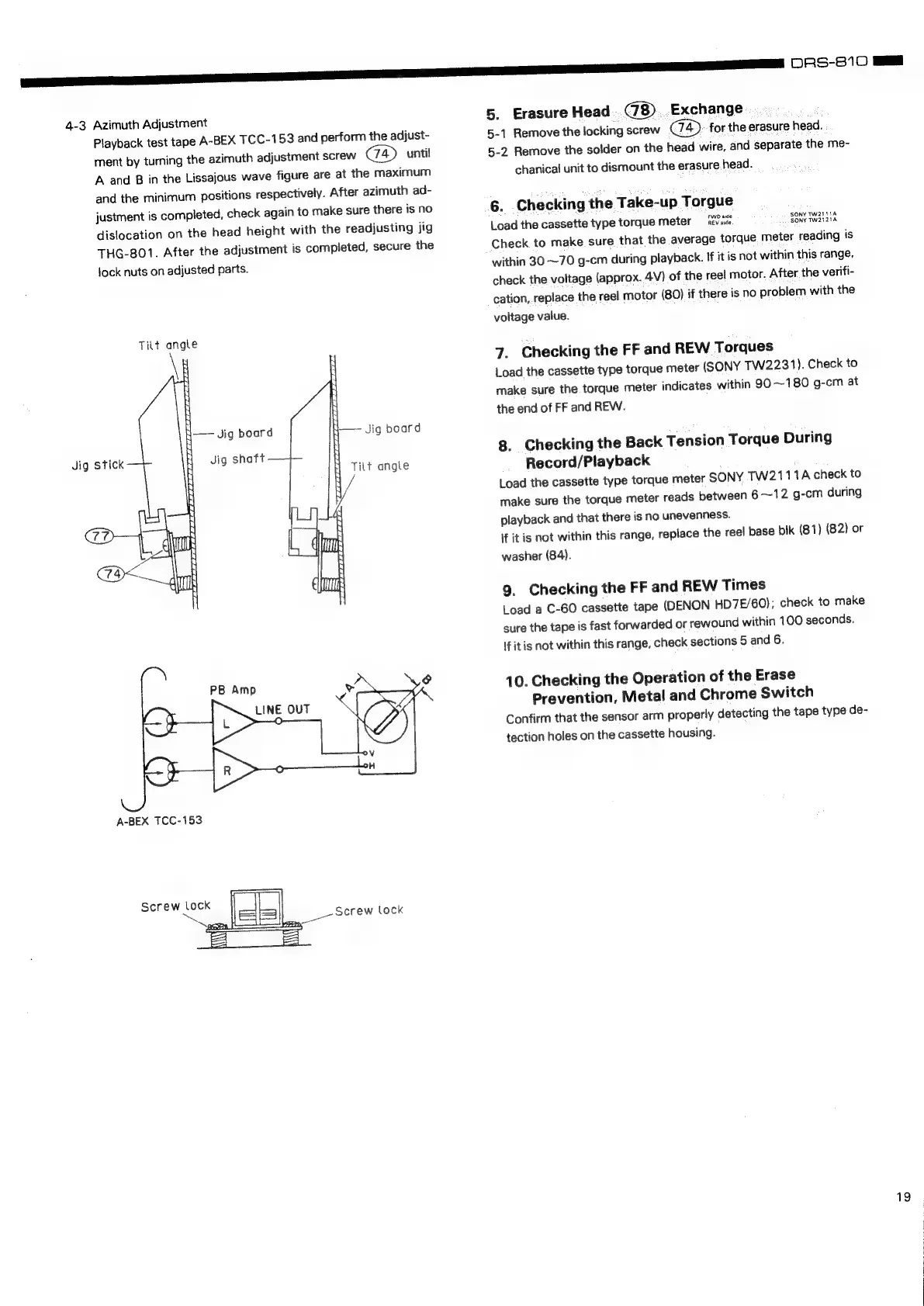 Denon DRS-810 - Detailed Electrical Checks and Adjustments; Azimuth and Erasure Head Servicing; Tape Transport Torque and Timing Checks; Tape Type Detection and Switch Checks