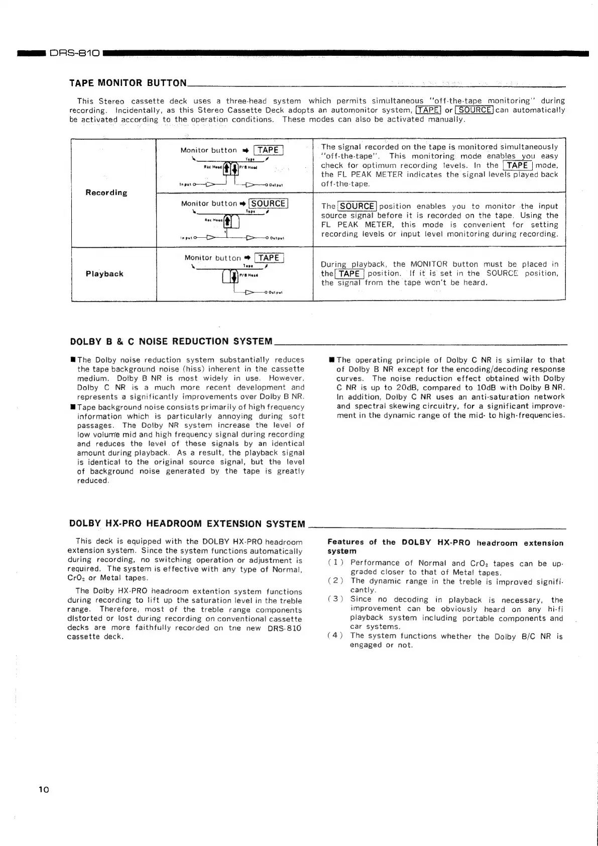 Denon DRS-810 - Tape Monitoring and Noise Reduction Systems; Using the Tape Monitor Button; Dolby B & C Noise Reduction Explained; Dolby HX-PRO Headroom Extension System