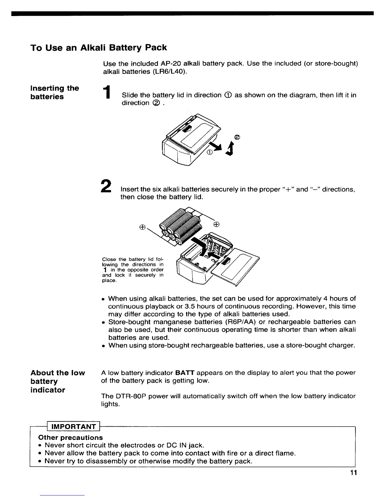 Denon DTR-80P - Alkali Battery Pack Usage; Inserting Batteries; Low Battery Indicator and Precautions