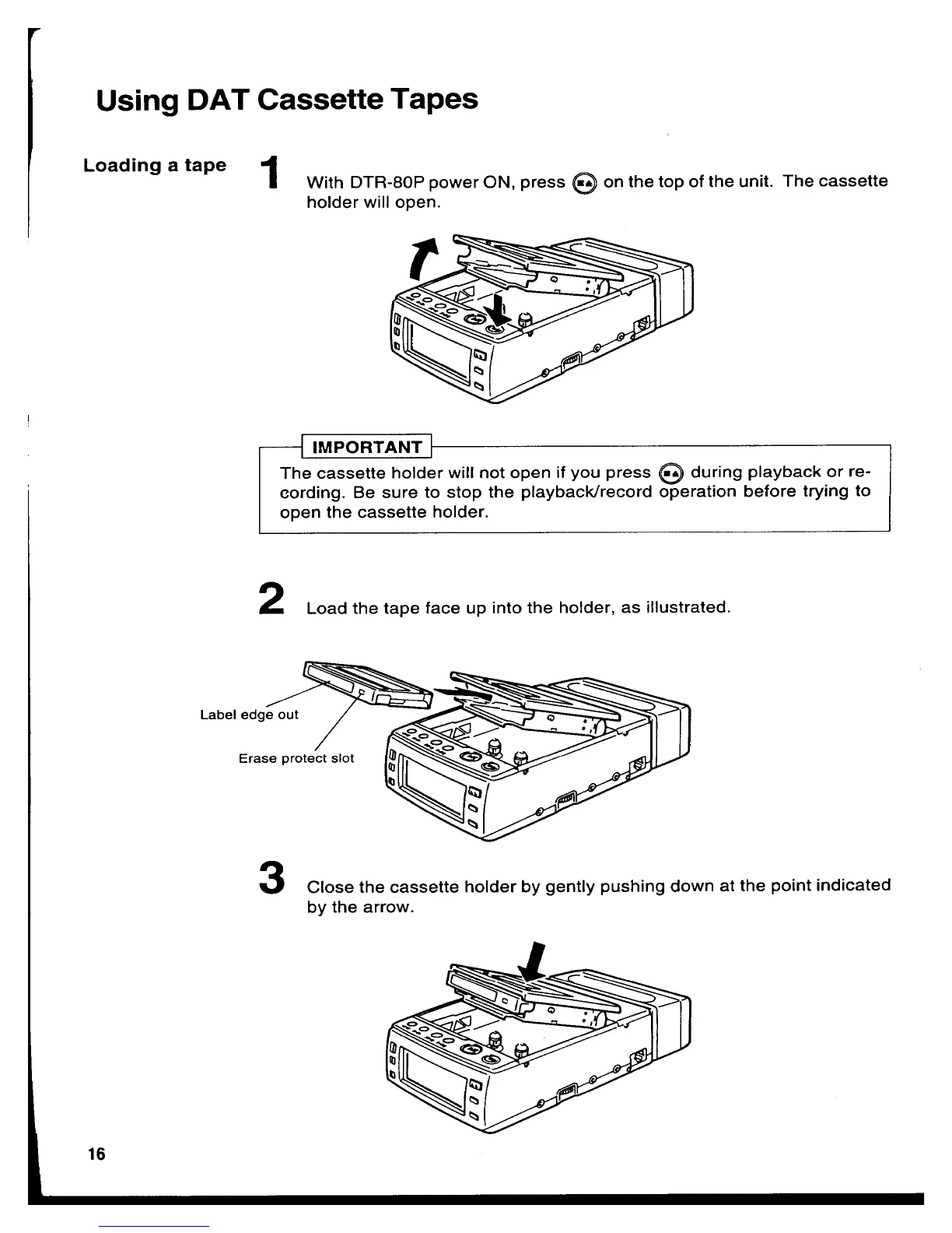 Denon DTR-80P - DAT Cassette Tape Operations; Loading a DAT Cassette; Important Loading Advisory