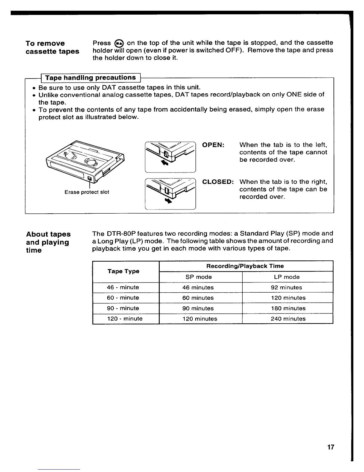 Denon DTR-80P - Cassette Tape Management; Removing a DAT Cassette; Tape Handling and Recording Time