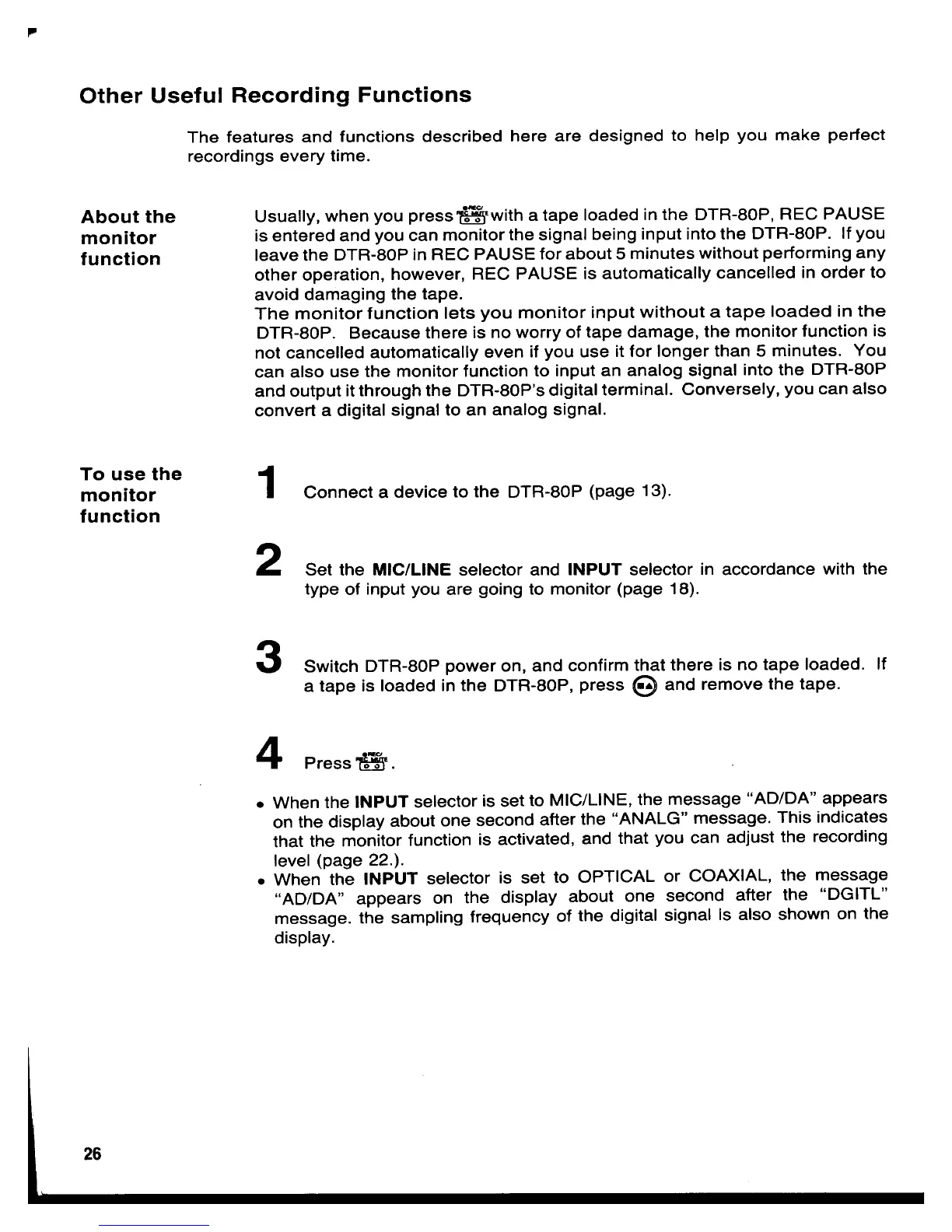 Denon DTR-80P - Advanced Recording Features; Monitor Function Overview; Activating the Monitor Function